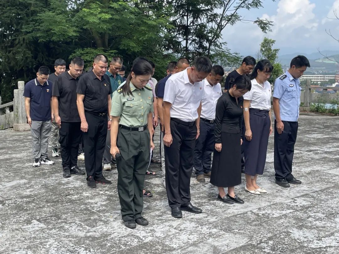 8月1日上午,在浮石镇烈士陵园祭扫现场,全体人员默哀致敬、行三鞠躬礼。
