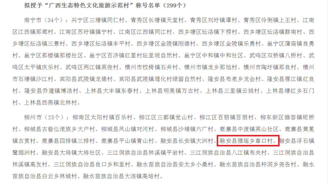 2023年11月21日,自治区生态环境厅、自治区文化和旅游厅、自治区农业农村厅对第二批百镇千村生态特色文化旅游示范镇村命名进行公示,融安县雅瑶乡章口村上榜。