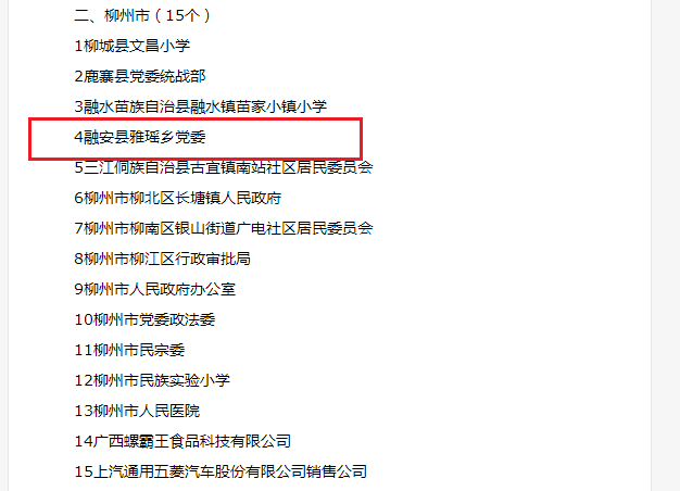 1月23日,根据中央和自治区关于开展民族团结进步模范评选表彰活动的有关工作部署,自治区党委、政府决定开展自治区第九次民族团结进步模范评选表彰工作。经各市、各有关单位民主推荐,自治区民族团结进步模范评选表彰工作领导小组办公室复审,自治区民族团结进步模范评选表彰工作领导小组审核,评选出拟表彰的候选模范集体200个、候选模范个人299名,进行公示。融安县雅瑶乡党委入选模范集体候选对象名单。