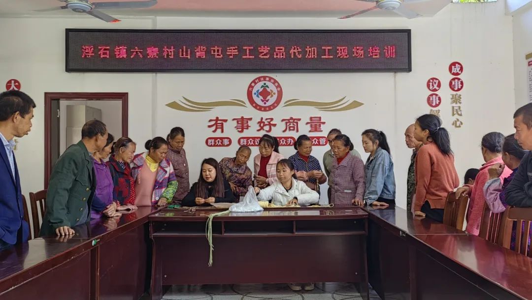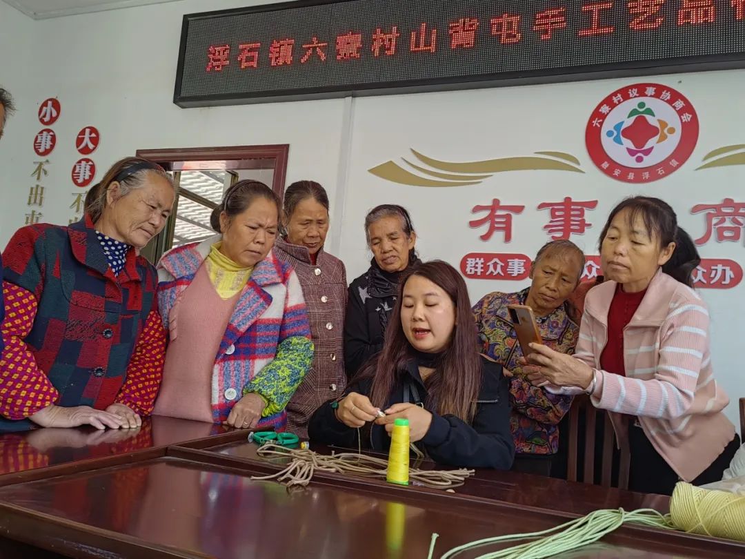 浮石镇六寮村山背屯手工艺品代加工培训现场,村民们正在学习手工艺品编织。