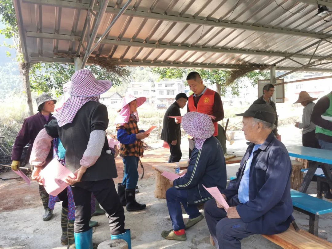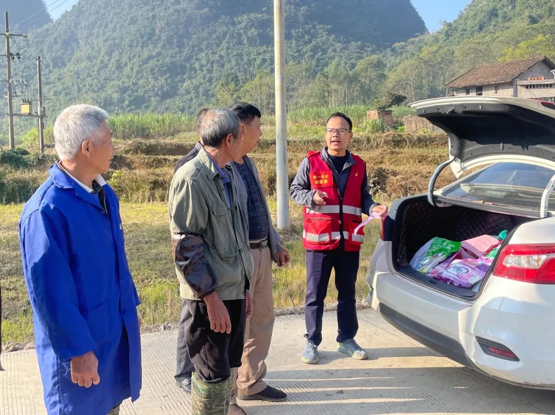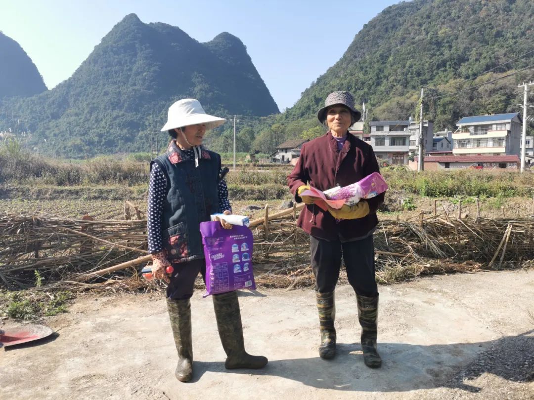 ▲11月27日,融安县桥板乡古板村拉范屯志愿者向村民宣传惠民政策。