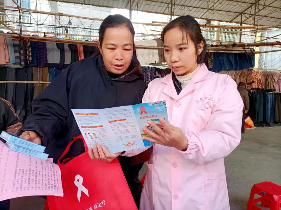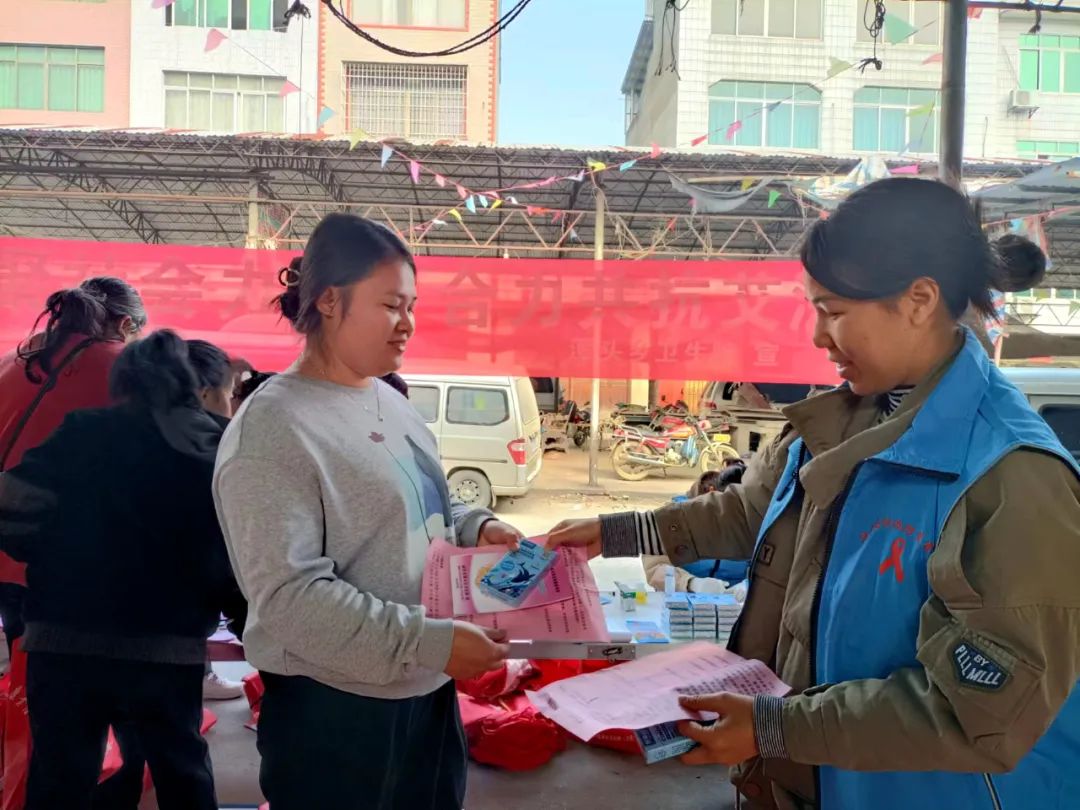 图2:12月1日,潭头乡在红岭街开展防艾滋病主题宣传,工作人员向群众发放宣传单册科普防艾知识。