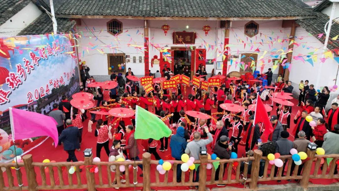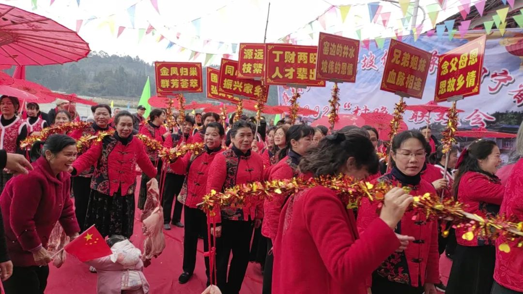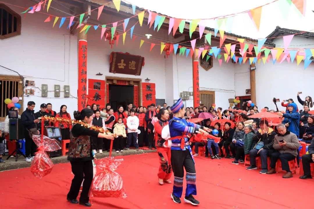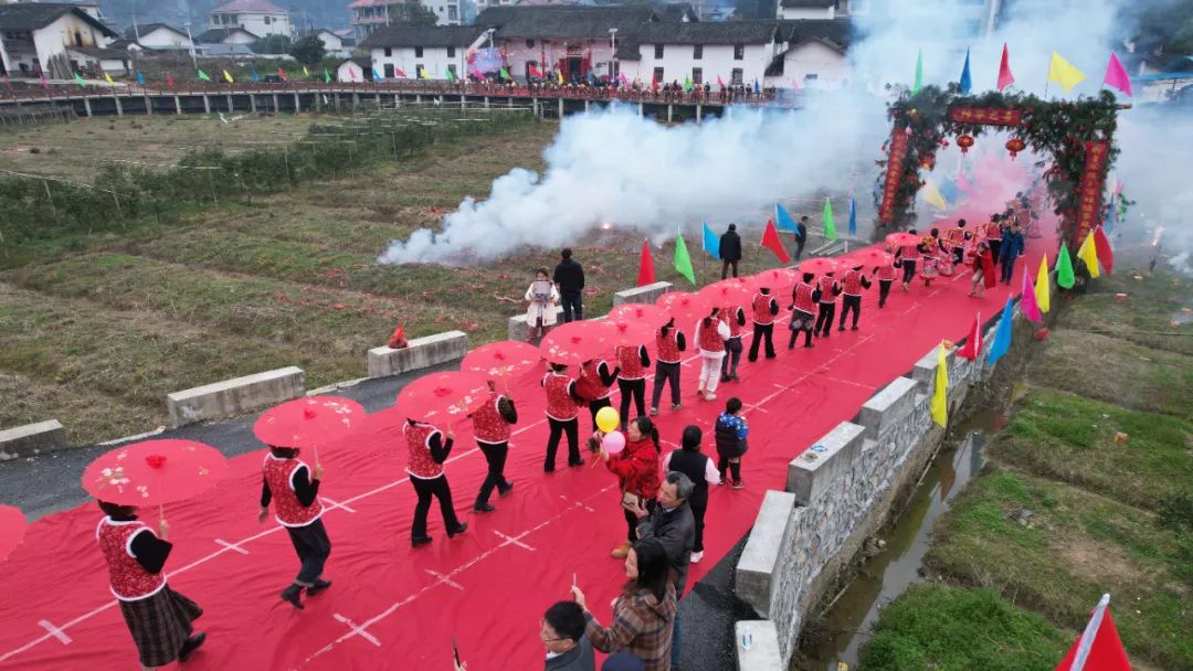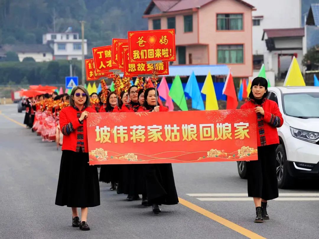 上午10时许,鞭炮齐鸣,屯道两旁彩旗飘扬,灯笼高悬,处处洋溢着喜庆氛围,外嫁姑娘身着大红礼服,或撑着花伞,或肩挑礼品,手举“爸妈,我们回家啦”“团结互助 弘扬孝道”等标语,踏上红毯,沿着熟悉的“进士”古宅步道,在乡亲们的拥簇下浩浩荡荡穿街过巷......她们一边欣赏着家乡的新容新貌,一边感叹家乡变得越来越美。