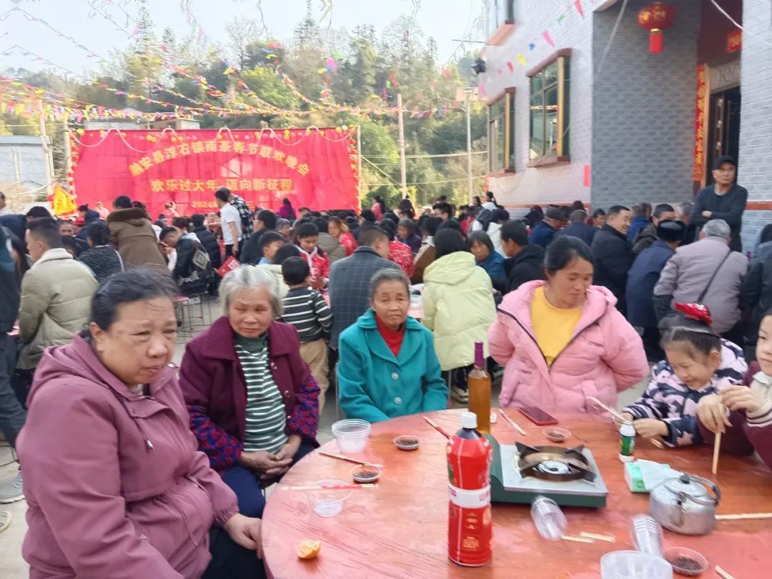 2月12日,六寮村山背屯举行2024年春节新年活动,全屯群众相聚在屯里的篮球场,一起吃年饭、叙乡情。