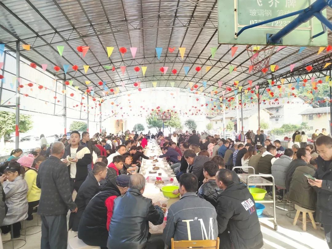 2月12日,六寮村山背屯举行集体过年迎新春活动,全屯群众相聚在屯里的篮球场,围着长桌一起吃年饭、叙乡情。