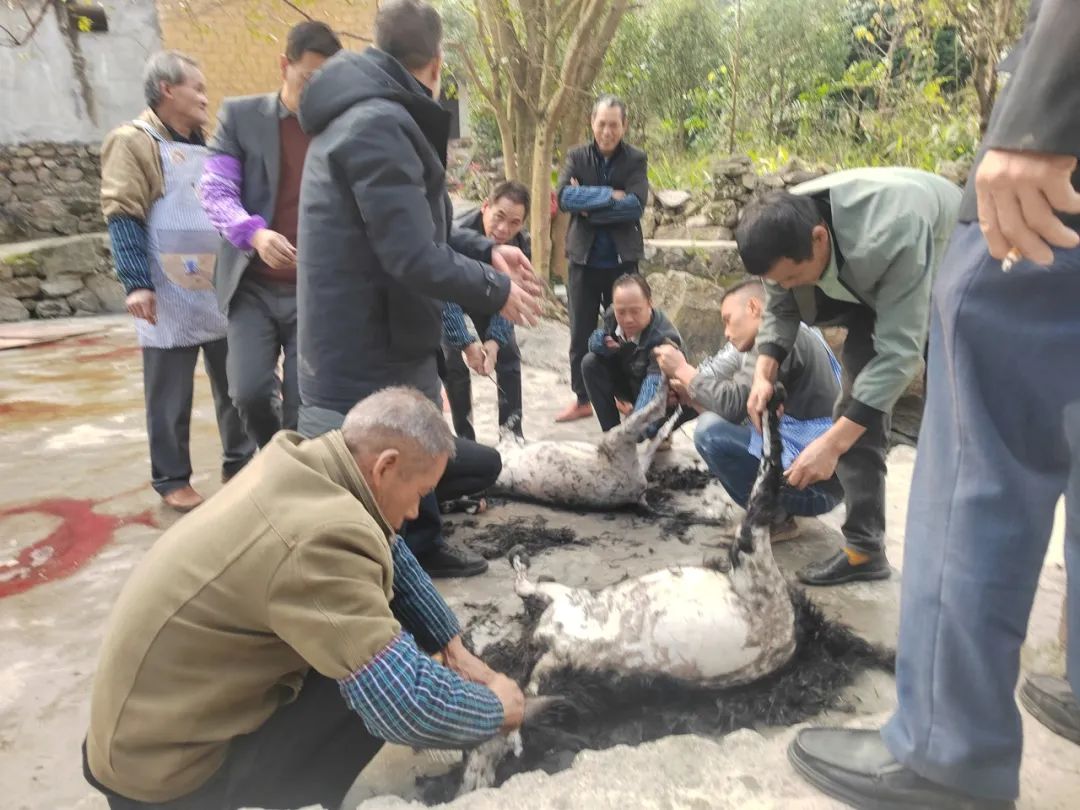 2月12日,六寮村山背屯群众杀猪杀羊为集体过年活动准备食材