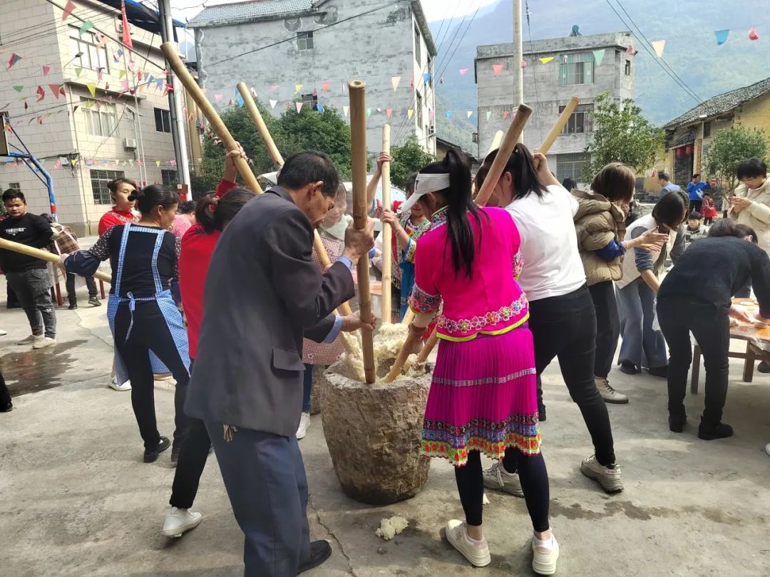 上午10点,山背屯的群众就聚集在一起,男同志杀猪杀羊,女同志洗菜打糍粑。糍粑按照屯里每户10个的量准备,寓意团团圆圆,十全十美。
