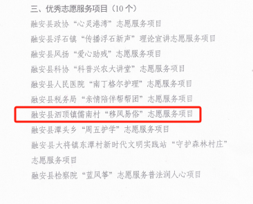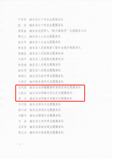 近日,精神文明建设委员会办公室关于命名2023年融安县优秀志愿者、优秀志愿服务组织(团队)和优秀志愿服务项目的决定,融安县泗顶镇儒南村宣传宣讲志愿服务队志愿者吴凤媛、融安县泗顶镇文化文艺志愿服务队志愿者卫庭妤、融安县泗顶镇乡村振兴志愿服务队志愿者曾添获评”优秀志愿者”,融安县泗顶镇儒南村“移风易俗”志愿服务项目获评“优秀志愿服务项目”。