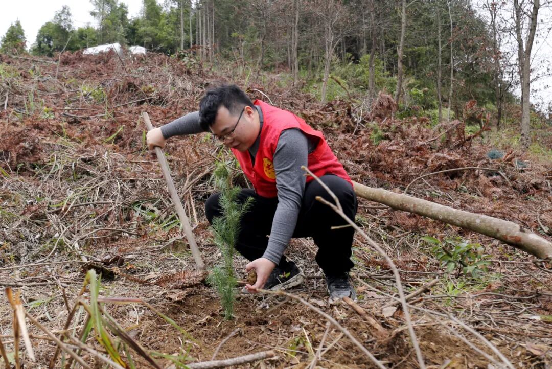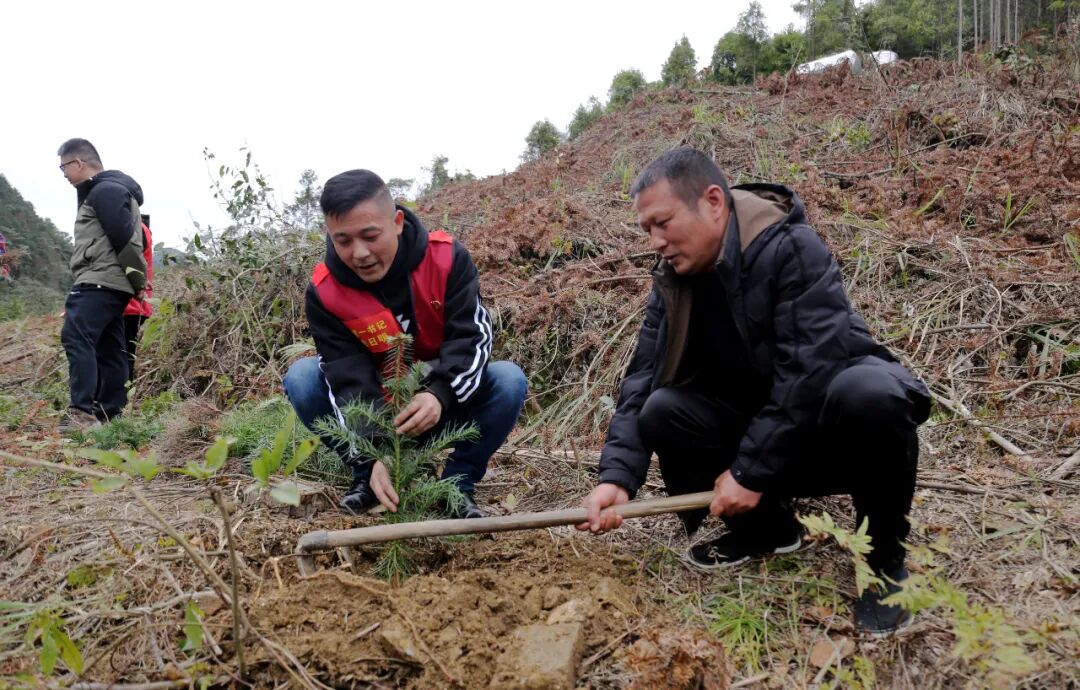 3月5日,在板榄镇拉谢村植树活动中,工作人员和志愿者正在种植杉木苗。(武巍 摄)