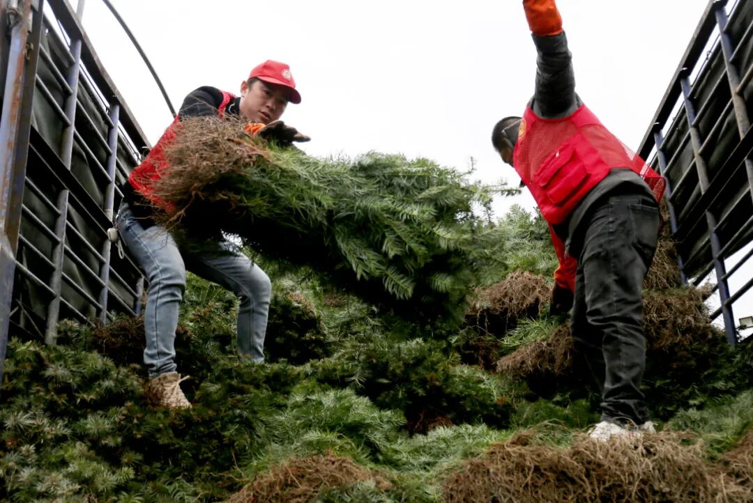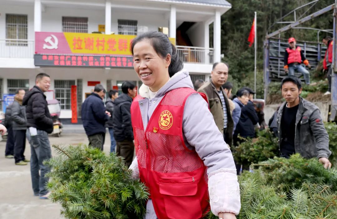 集中培训结束后,在镇、村干部,驻村工作队和志愿者的组织下,现场为村民发放杉木树苗。一时间,拉谢村委大院中车来人往,热闹非凡,村民们高兴地将一捆捆杉木树苗搬上车挑上山栽种。据统计,本次共计发放杉木树苗近8万株。