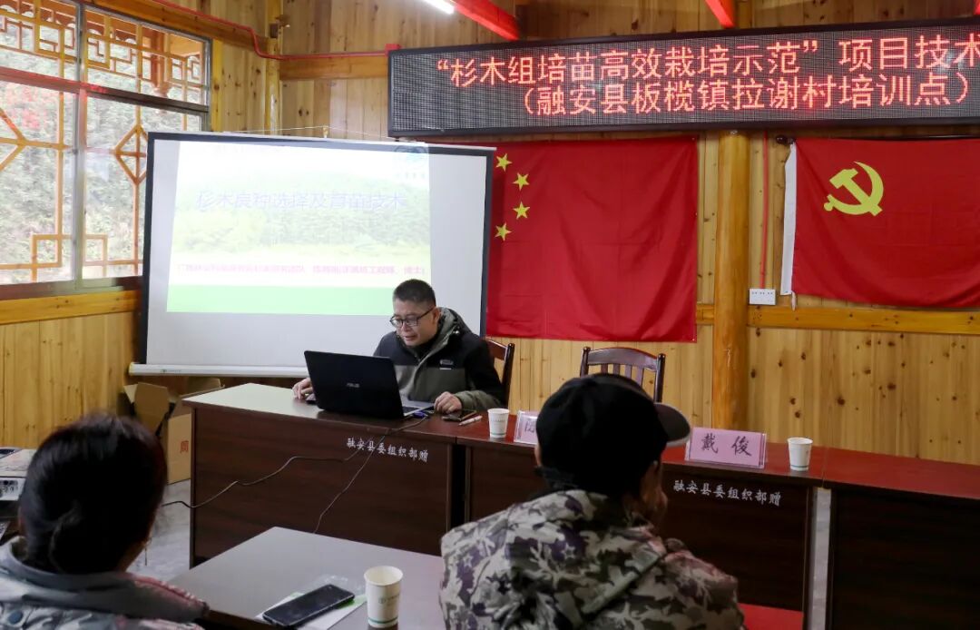 在拉谢村委会议室,来自广西林科院的技术专家就杉木栽培技术进行集中指导培训,讲解栽植技术要点和注意事项,使大家更透彻的了解杉木栽植的细枝末节技巧和重点,确保农户栽种科学,管护得当,让树苗成为群众的“致富树”,实现致富增收。大家都全神贯注的听讲、对照阅读科普书籍,并对杉木种植中发现的问题进行了咨询提问和热烈的讨论。