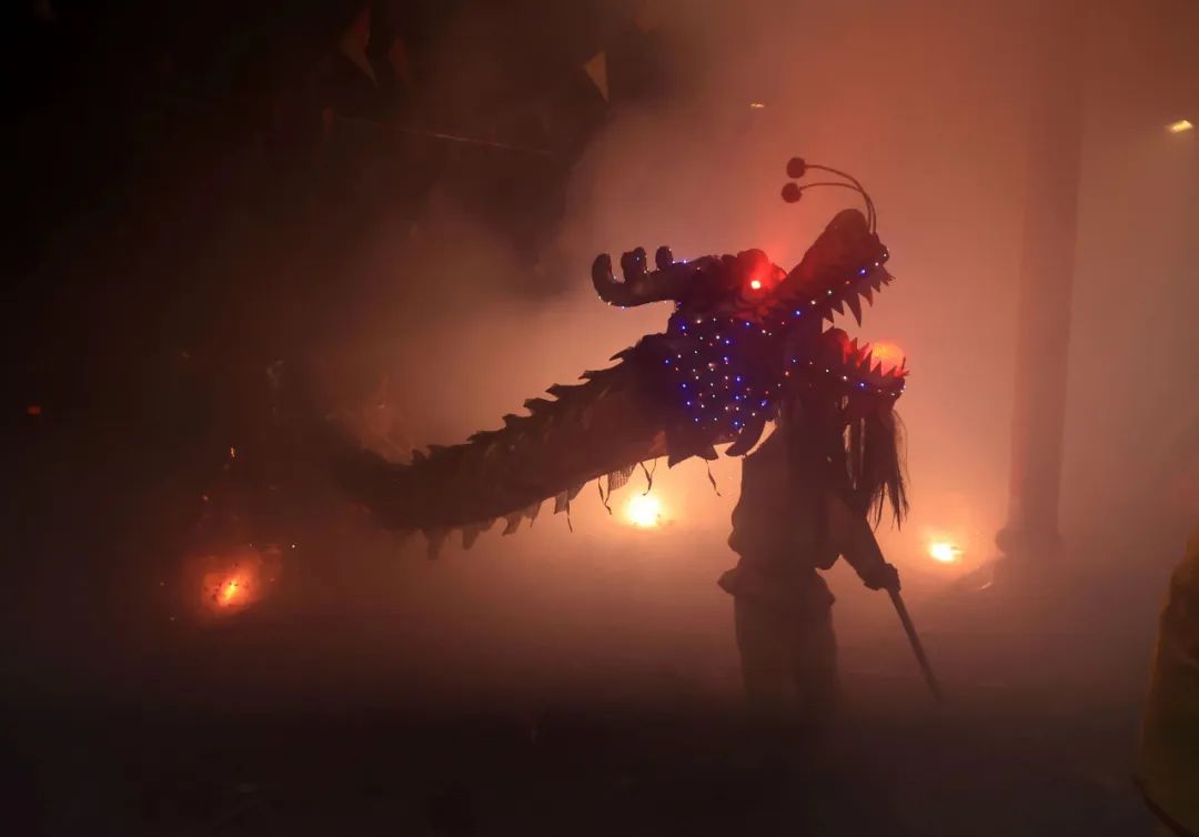 村晚现场,群众正在欣赏舞炮龙、鱼灯展示。