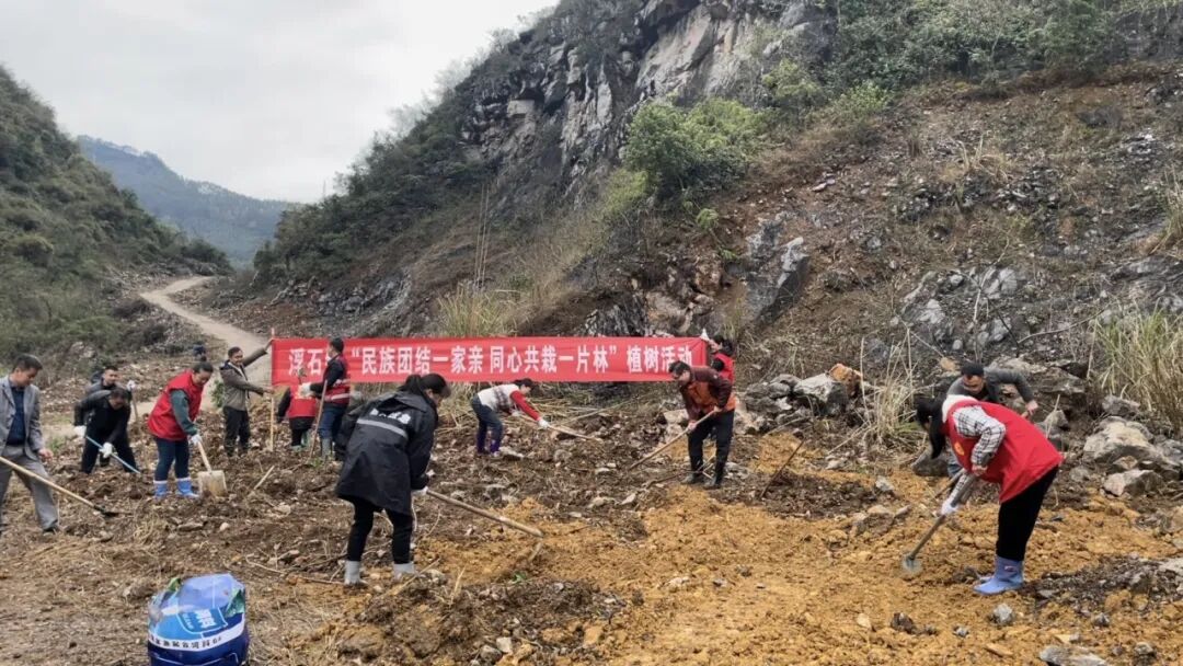 3月14日上午,浮石镇在六寮村山背屯开展“种花添彩美化乡村环境,支部联建助力乡村振兴”主题党日活动现场