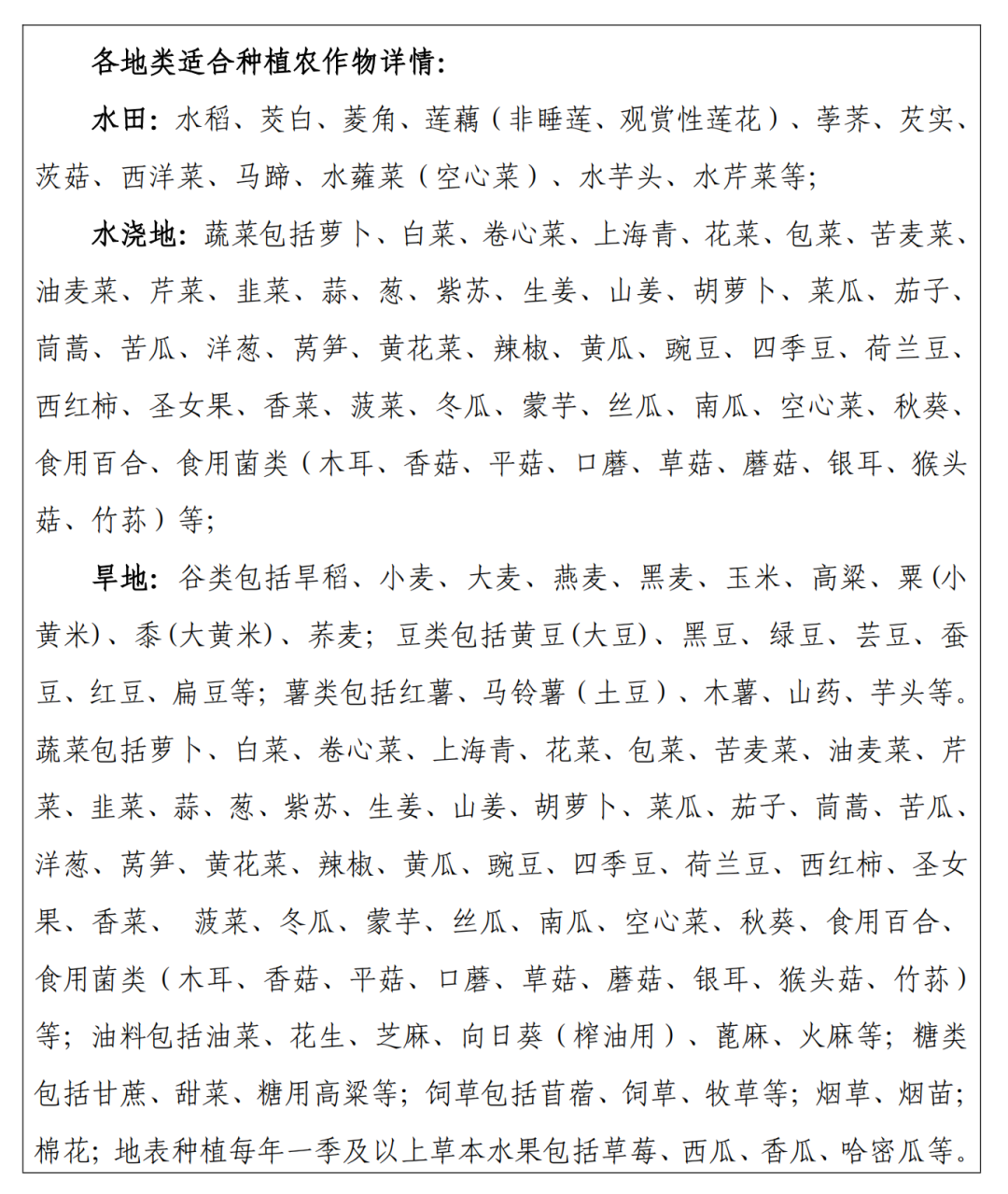 1.水田:水田指用于种植水稻、莲藕等水生农作物的耕地。包括实行水生、旱生农作物轮种的耕地。如种植水稻、茭白、菱角、莲藕、荸荠、芡实、西洋菜、马蹄等的耕地。