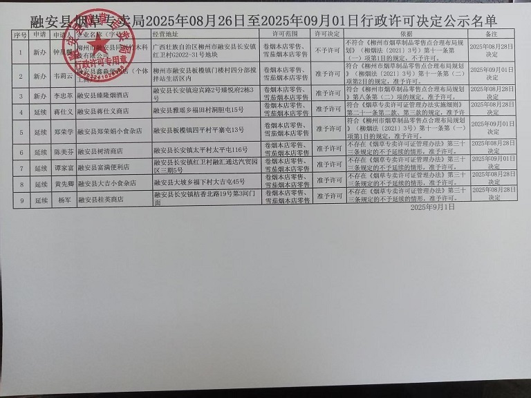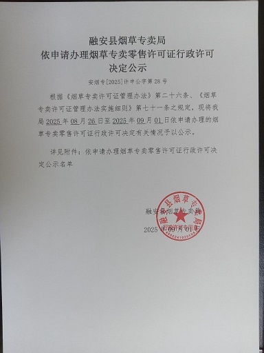 融安县烟草专卖局依申请办理烟草专卖零售许可证行政许可决定公示(安烟专【2025】许申公字第28号)