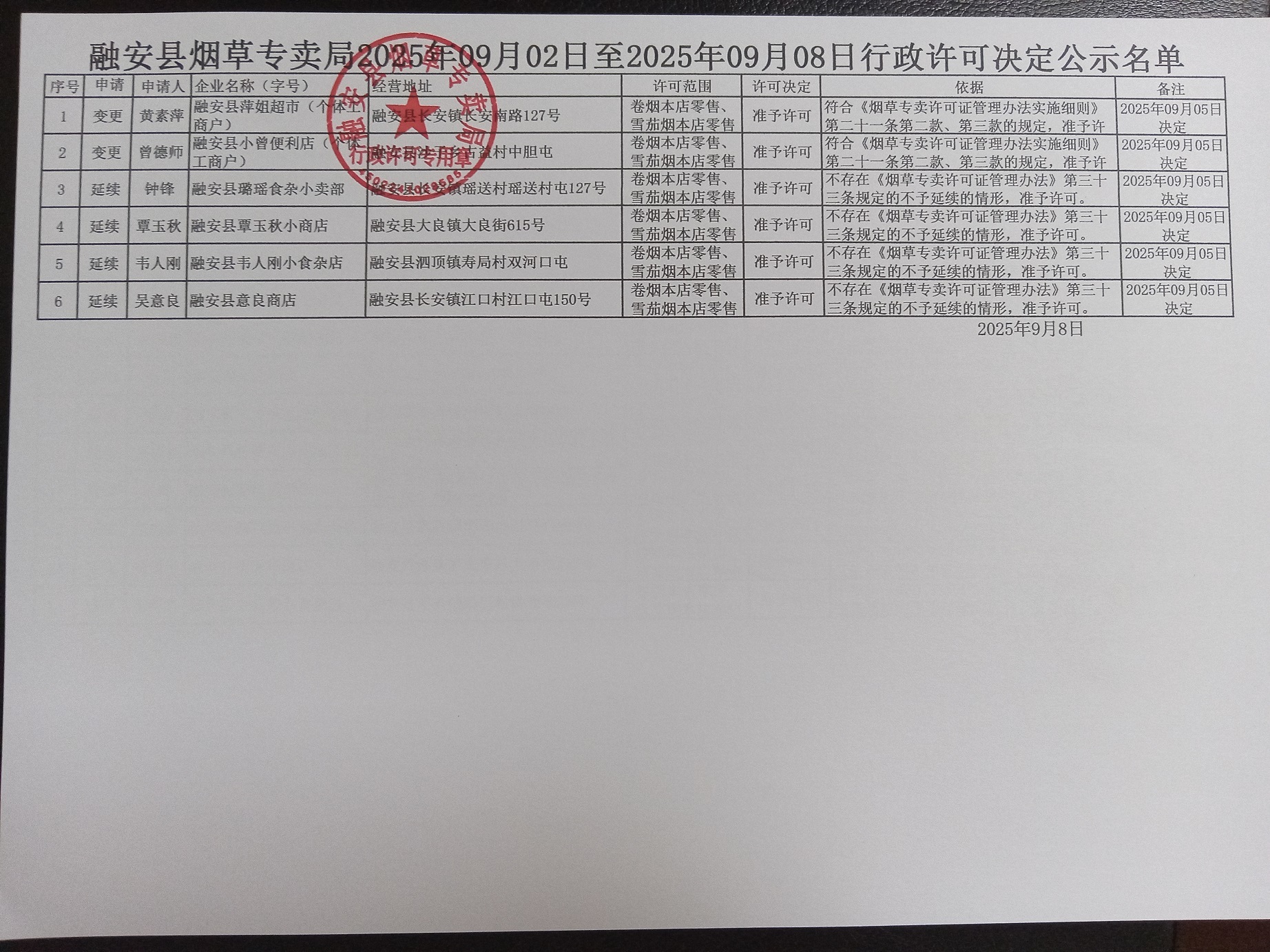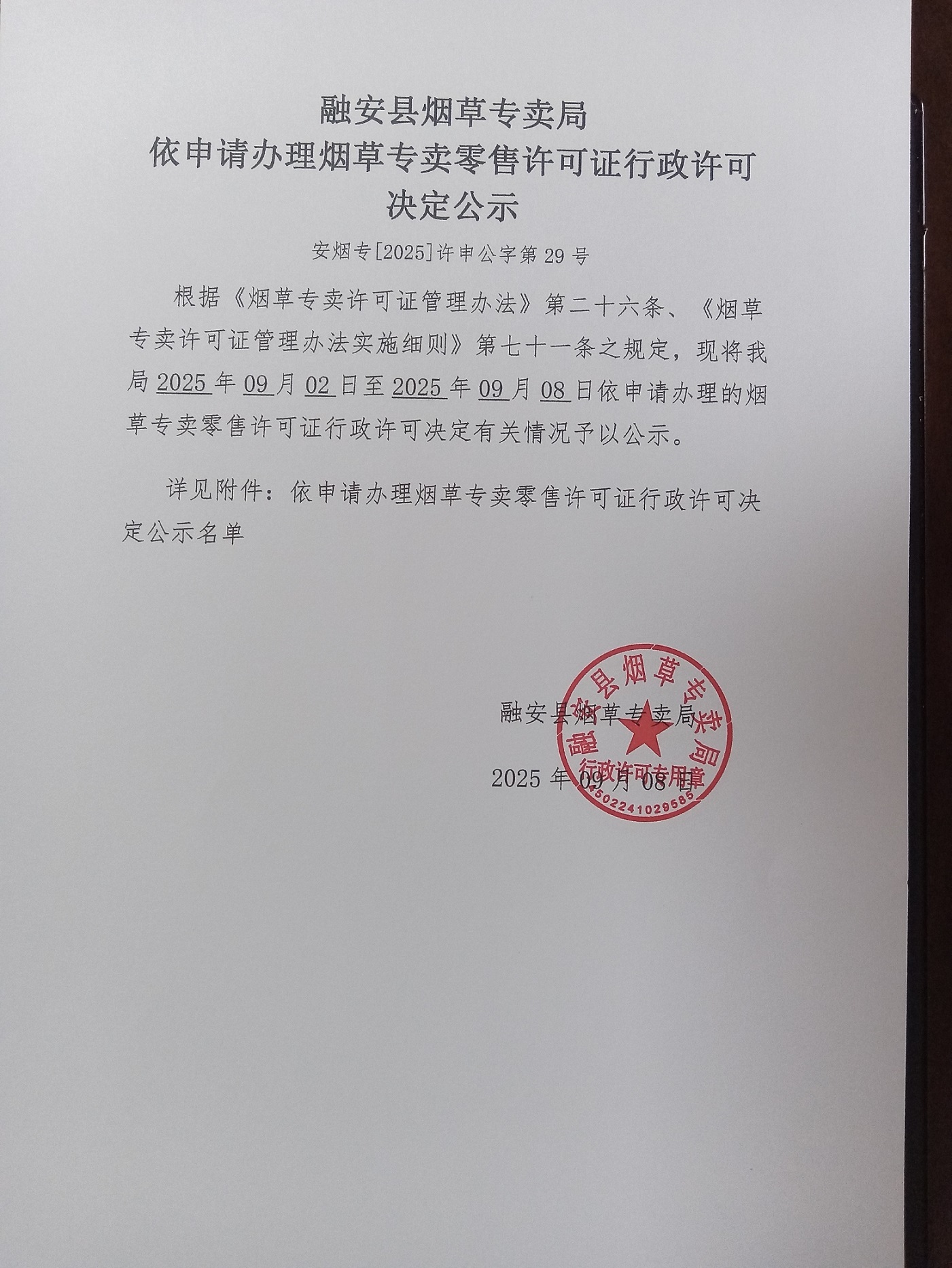 融安县烟草专卖局依申请办理烟草专卖零售许可证行政许可决定公示(安烟专【2025】许申公字第29号)