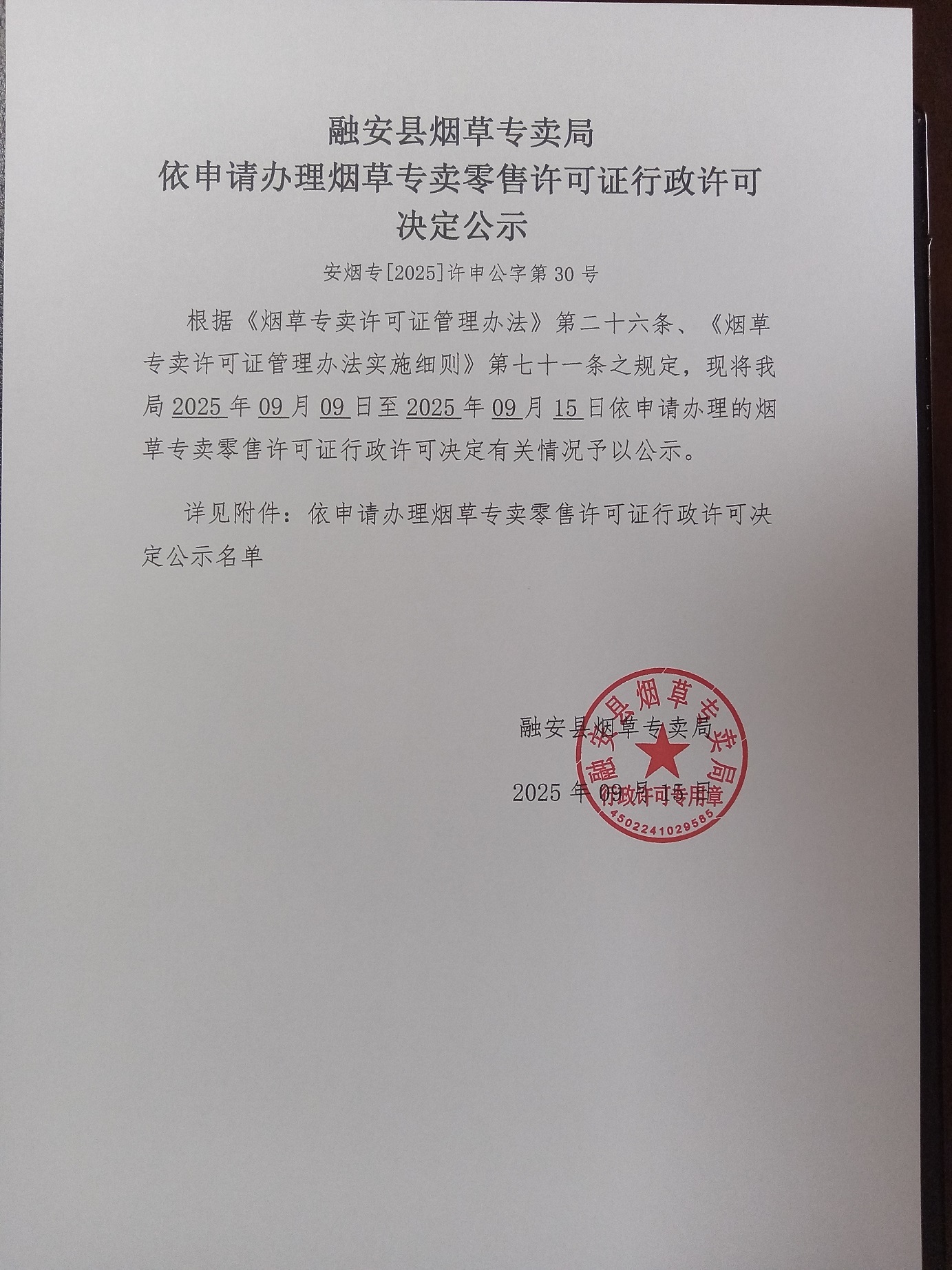 融安县烟草专卖局依申请办理烟草专卖零售许可证行政许可决定公示(安烟专【2025】许申公字第30号)