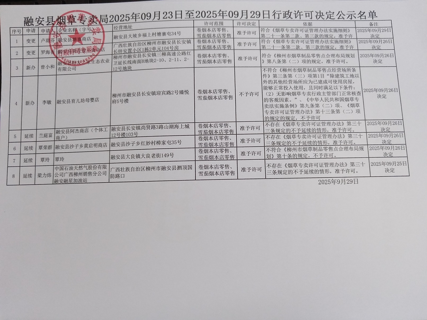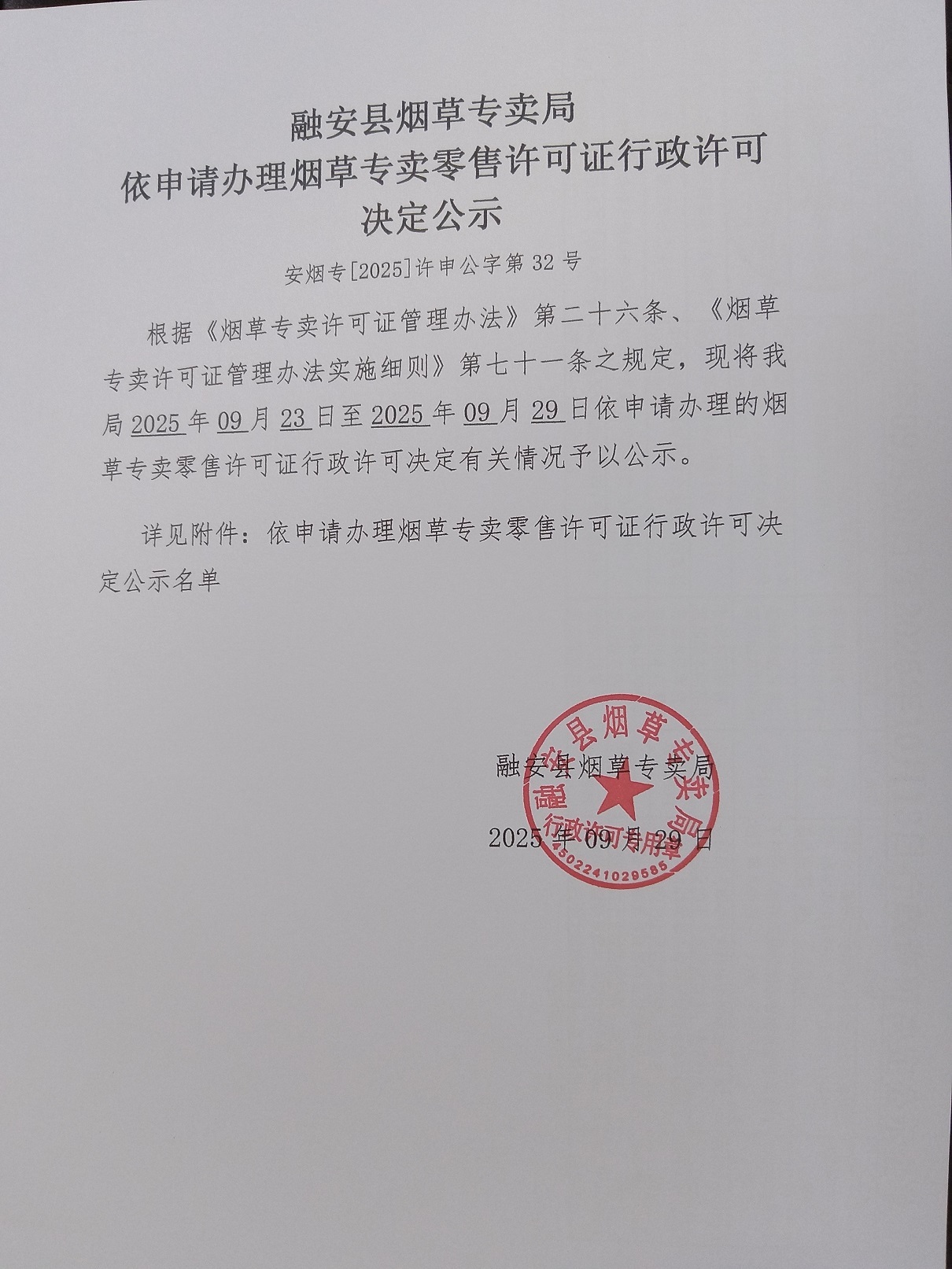融安县烟草专卖局依申请办理烟草专卖零售许可证行政许可决定公示(安烟专【2025】许申公字第32号)