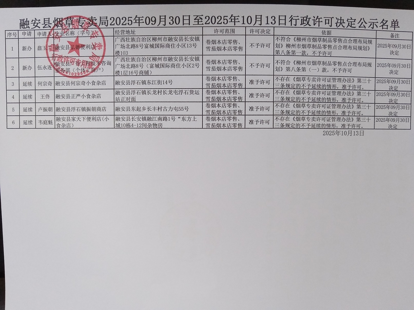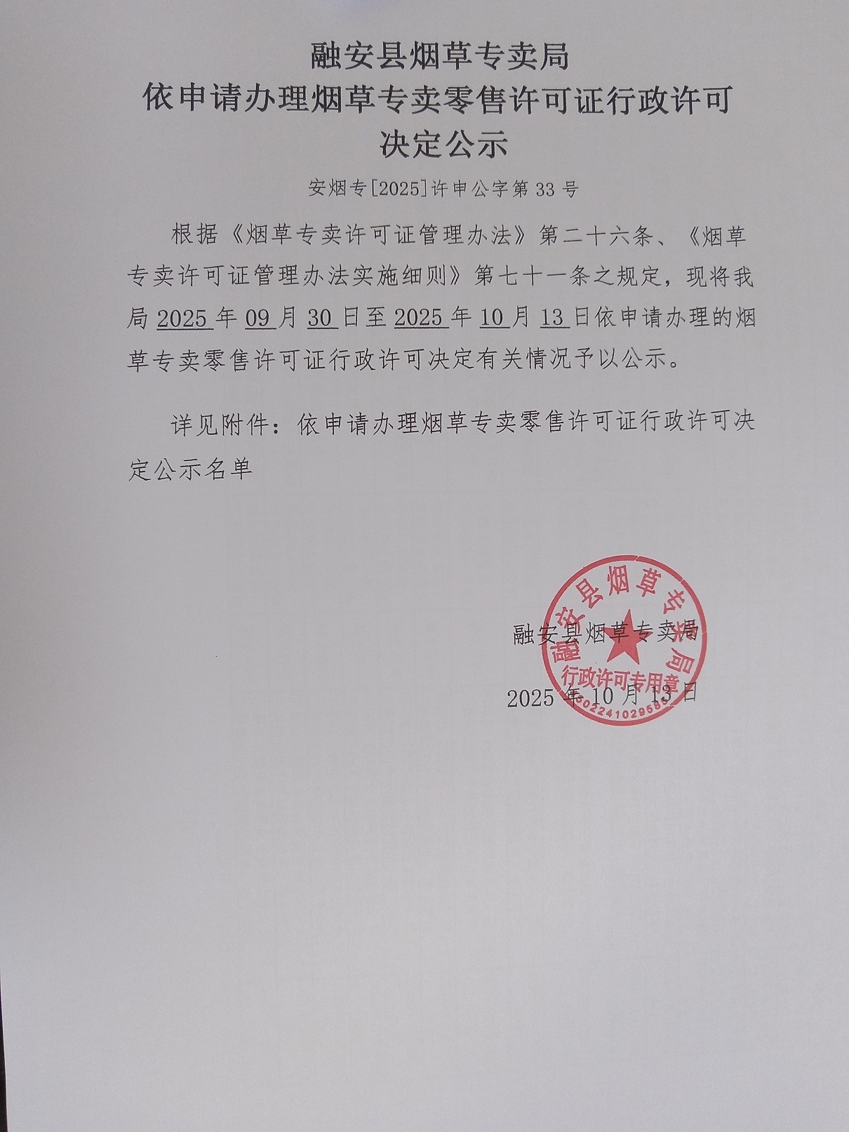 融安县烟草专卖局依申请办理烟草专卖零售许可证行政许可决定公示(安烟专【2025】许申公字第33号)