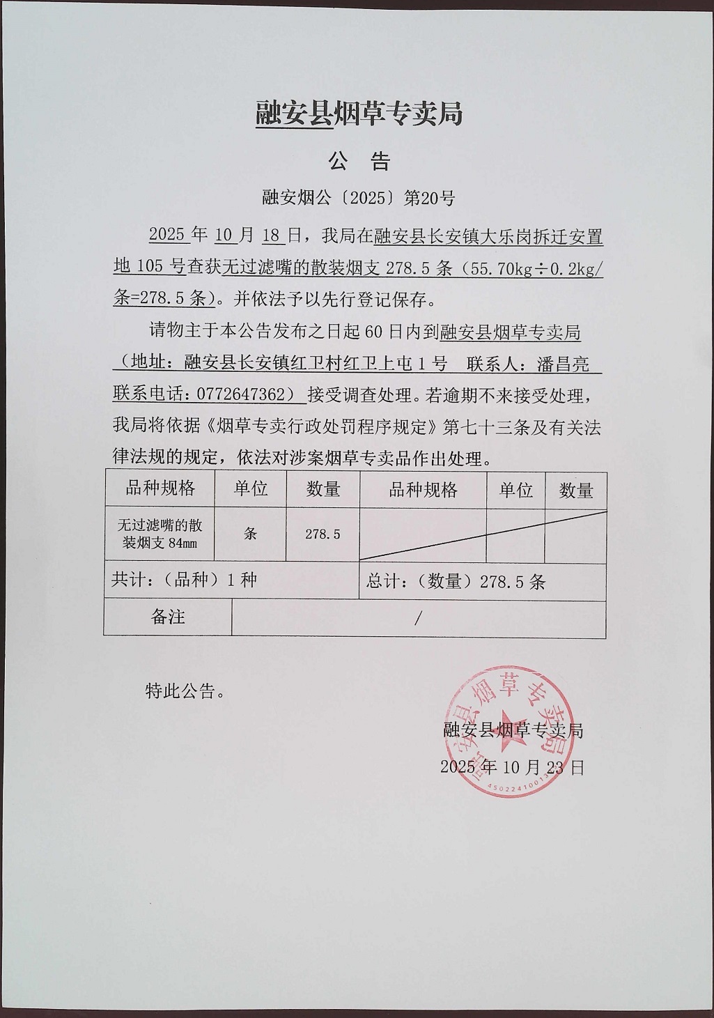 融安县烟草专卖局公告(融安烟公【2025】第20号)