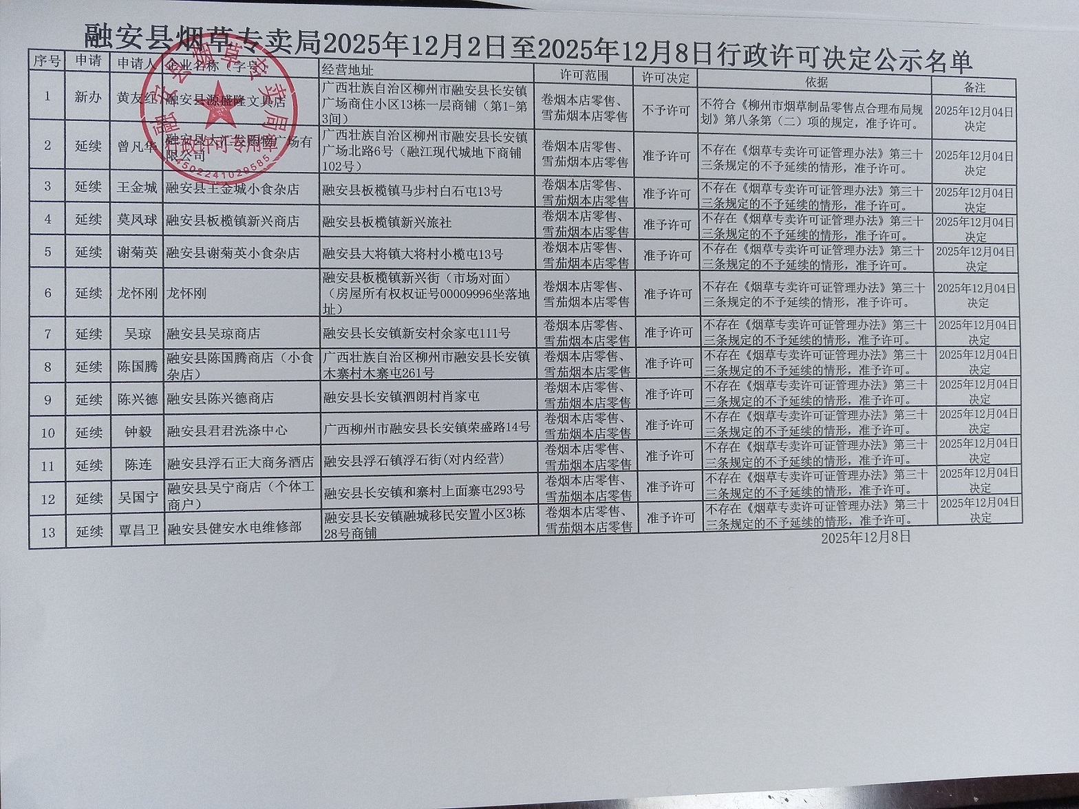 融安县烟草专卖局依申请办理烟草专卖零售许可证行政许可决定公示(安烟专【2025】许申公字第40号)