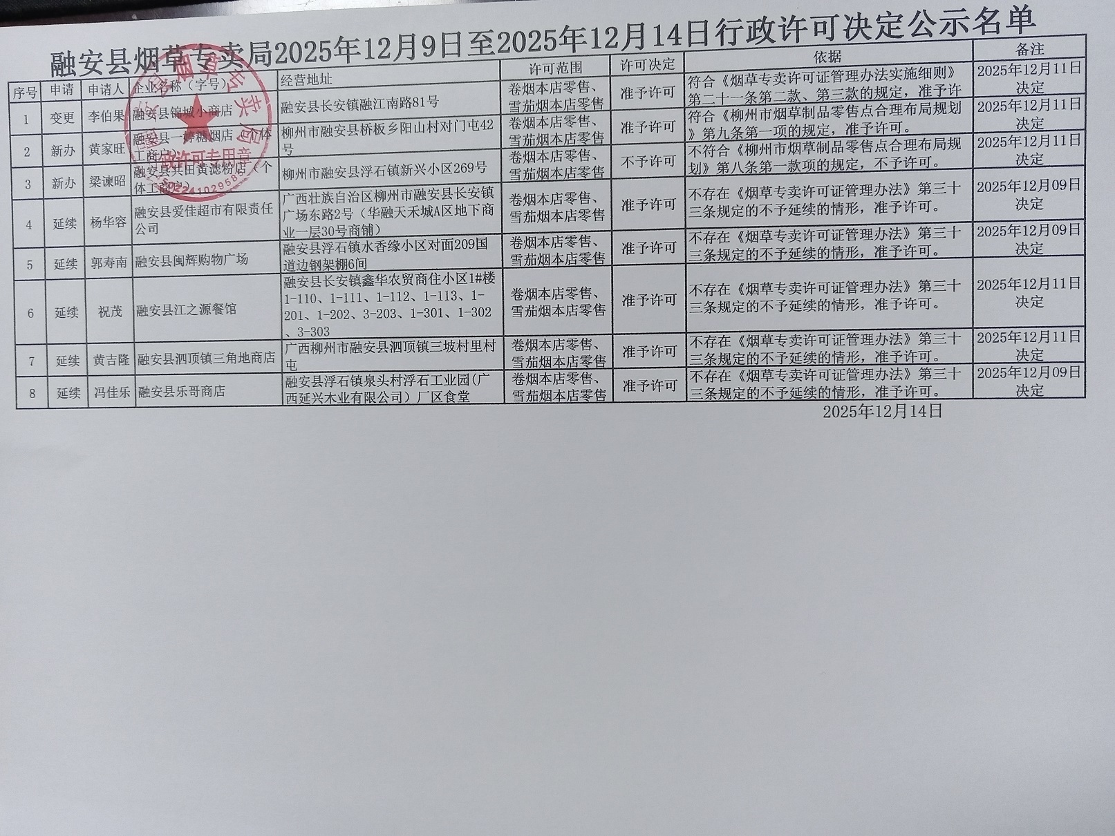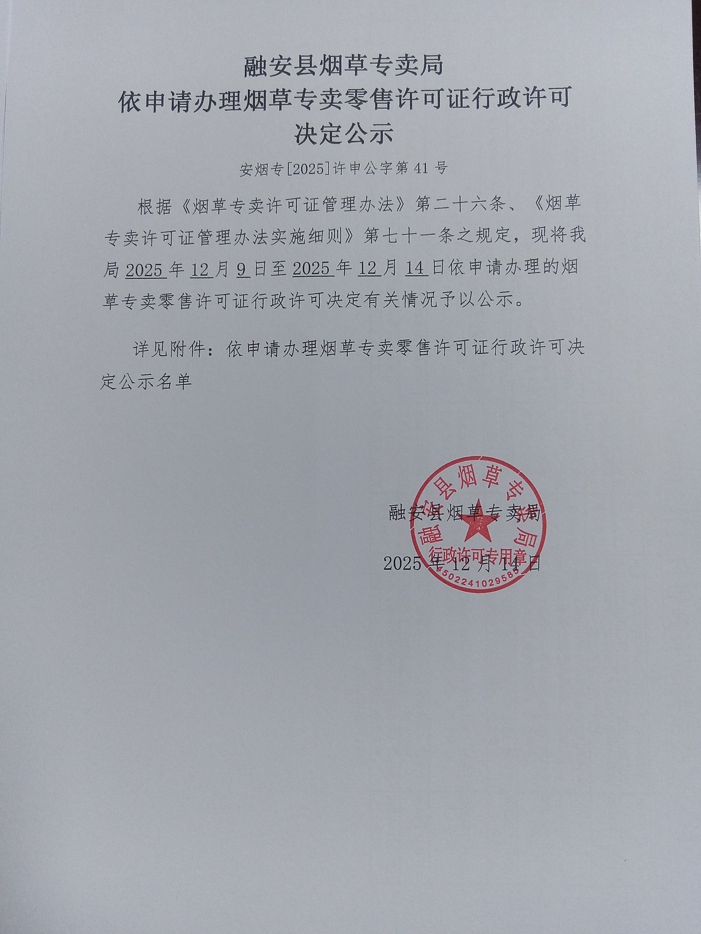 融安县烟草专卖局依申请办理烟草专卖零售许可证行政许可决定公示(安烟专【2025】许申公字第41号)