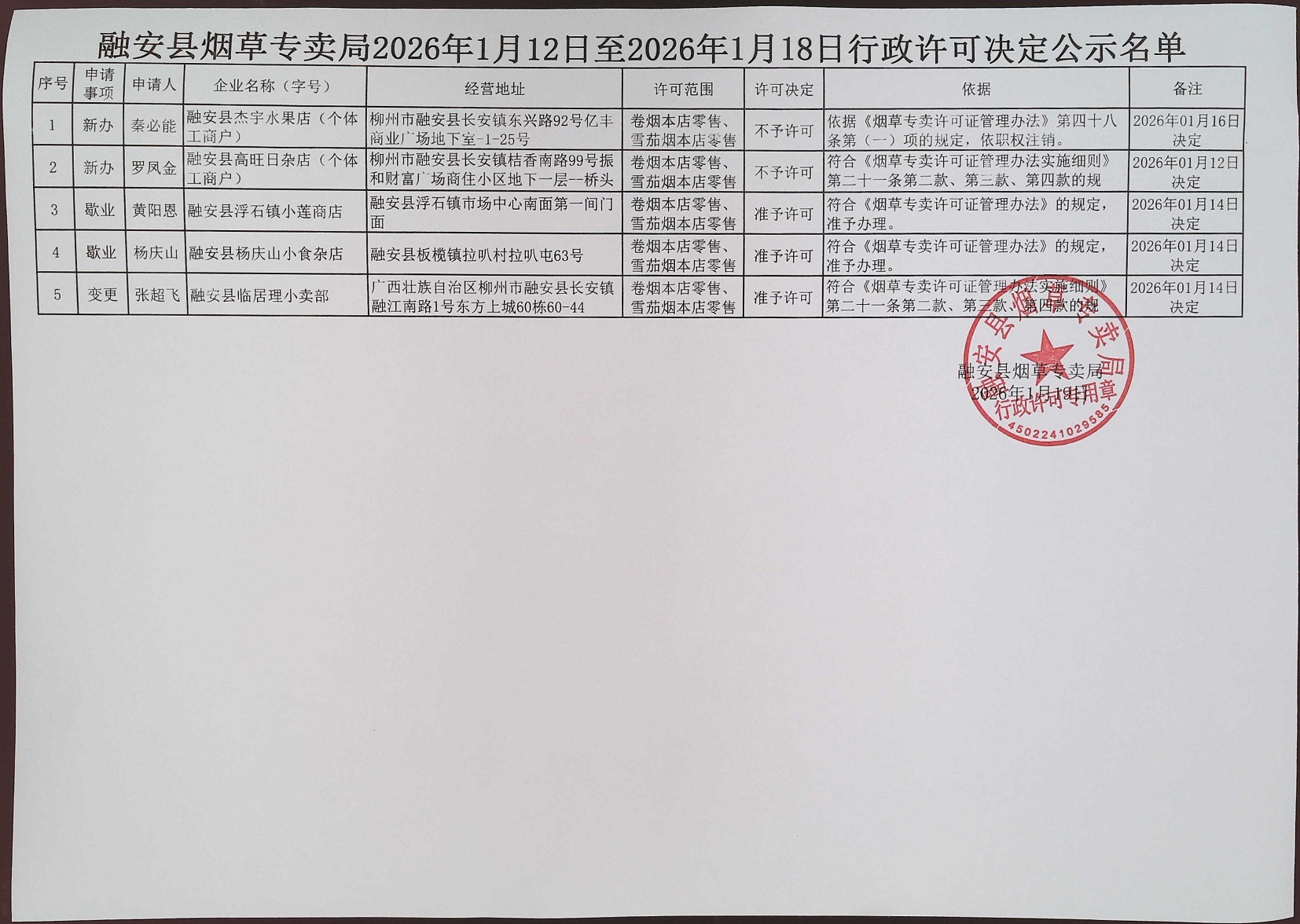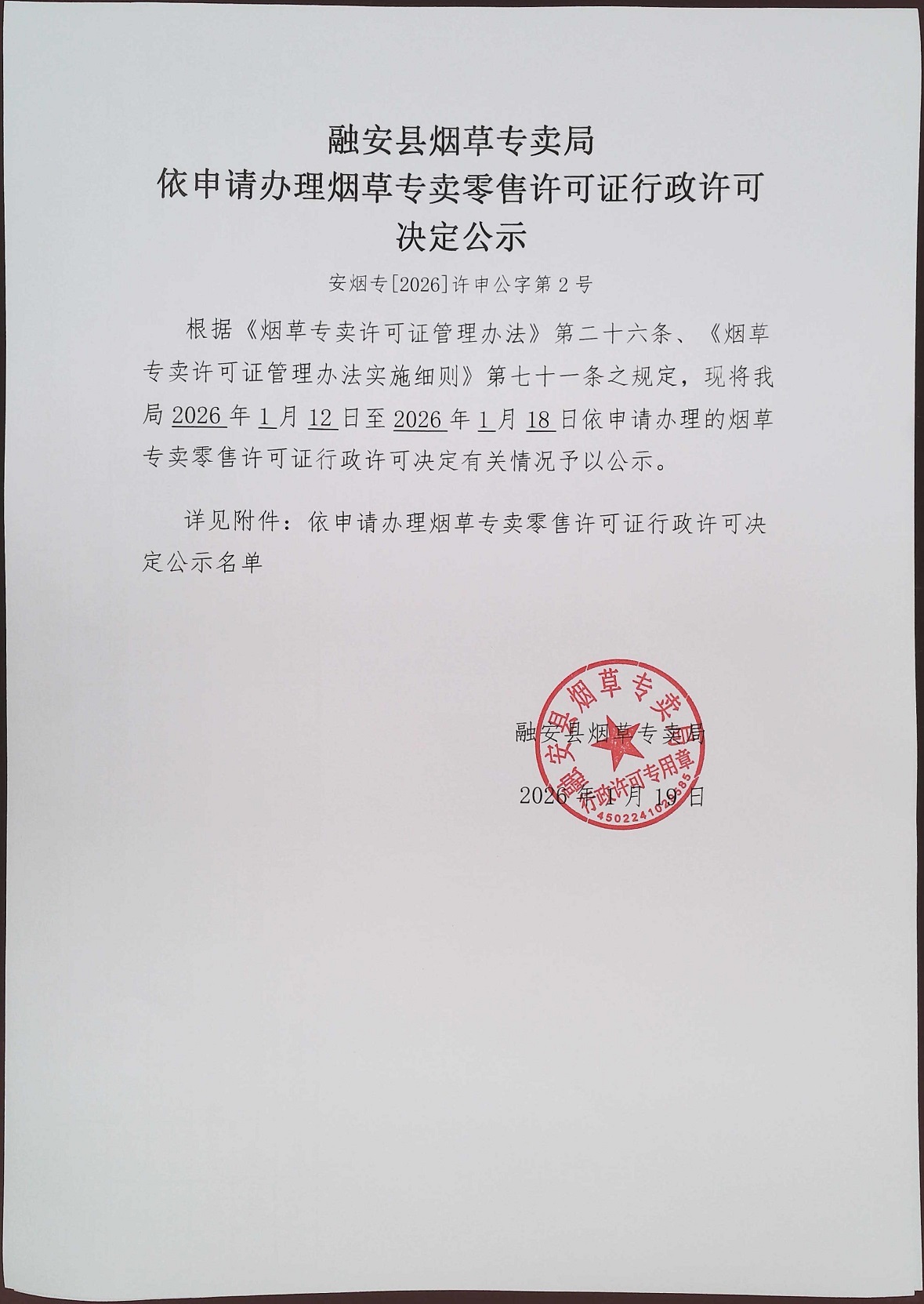 融安县烟草专卖局依申请办理烟草专卖零售许可证行政许可决定公示(安烟专【2026】许申公字第2号)