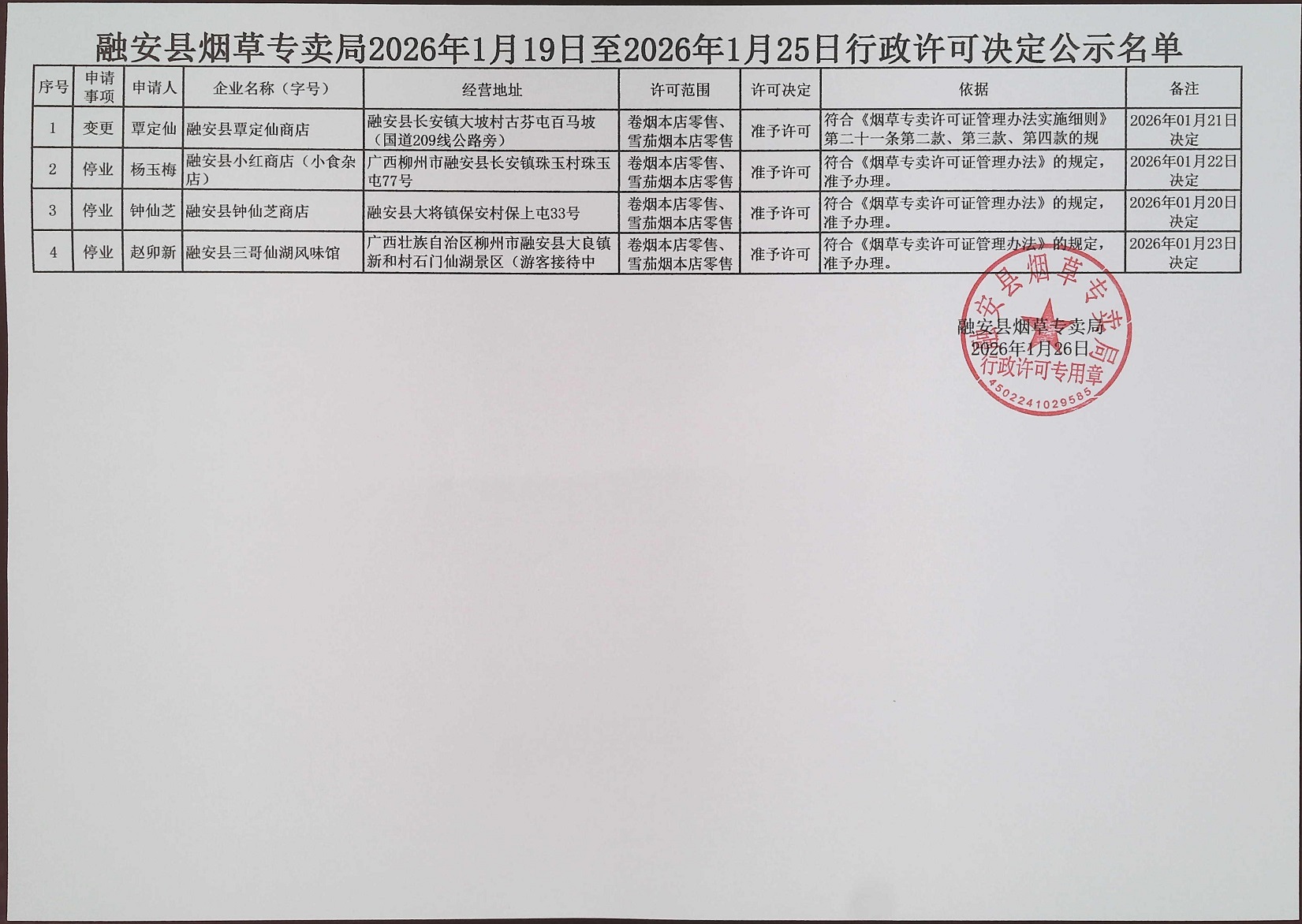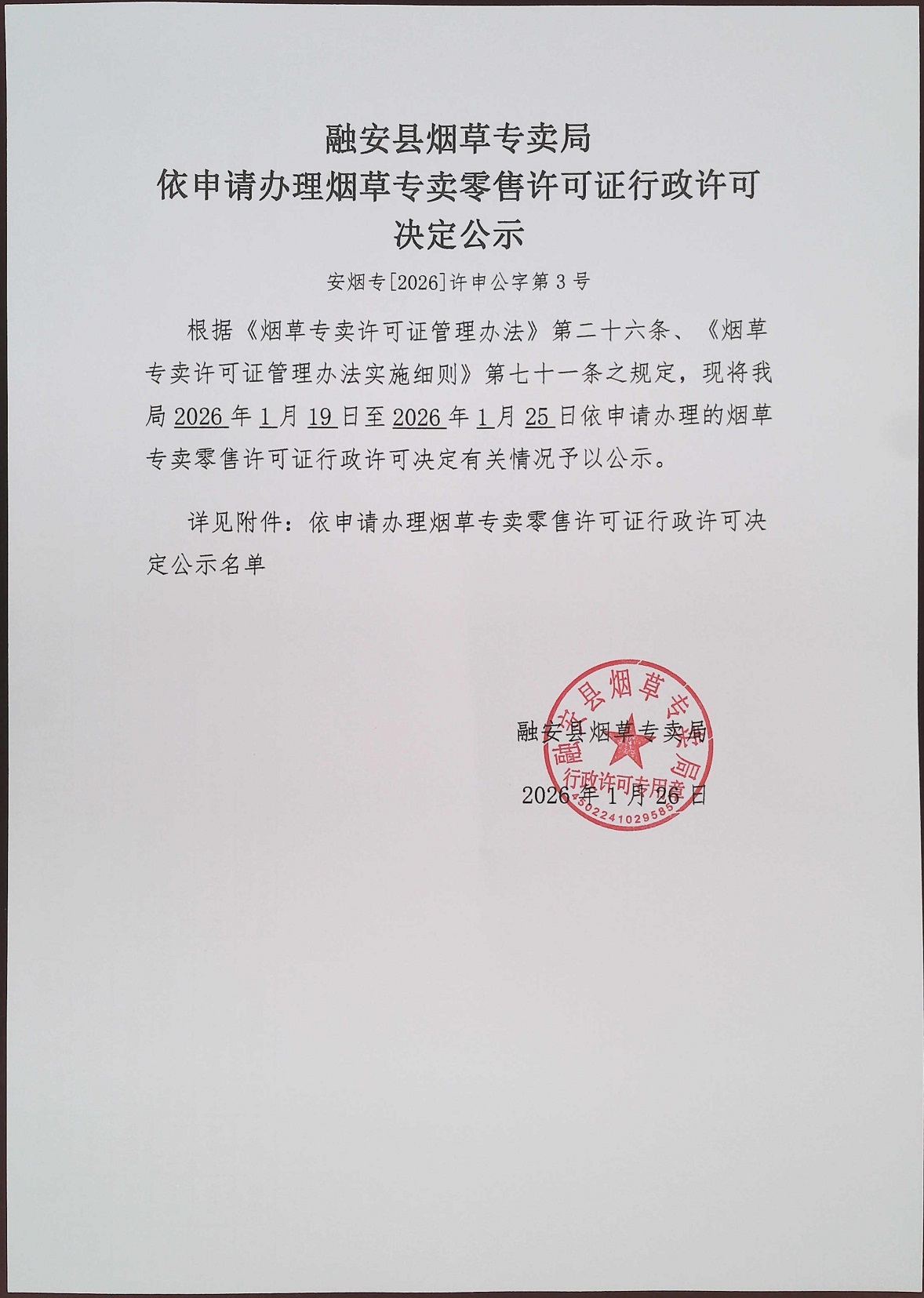 融安县烟草专卖局依申请办理烟草专卖零售许可证行政许可决定公示(安烟专【2026】许申公字第3号)