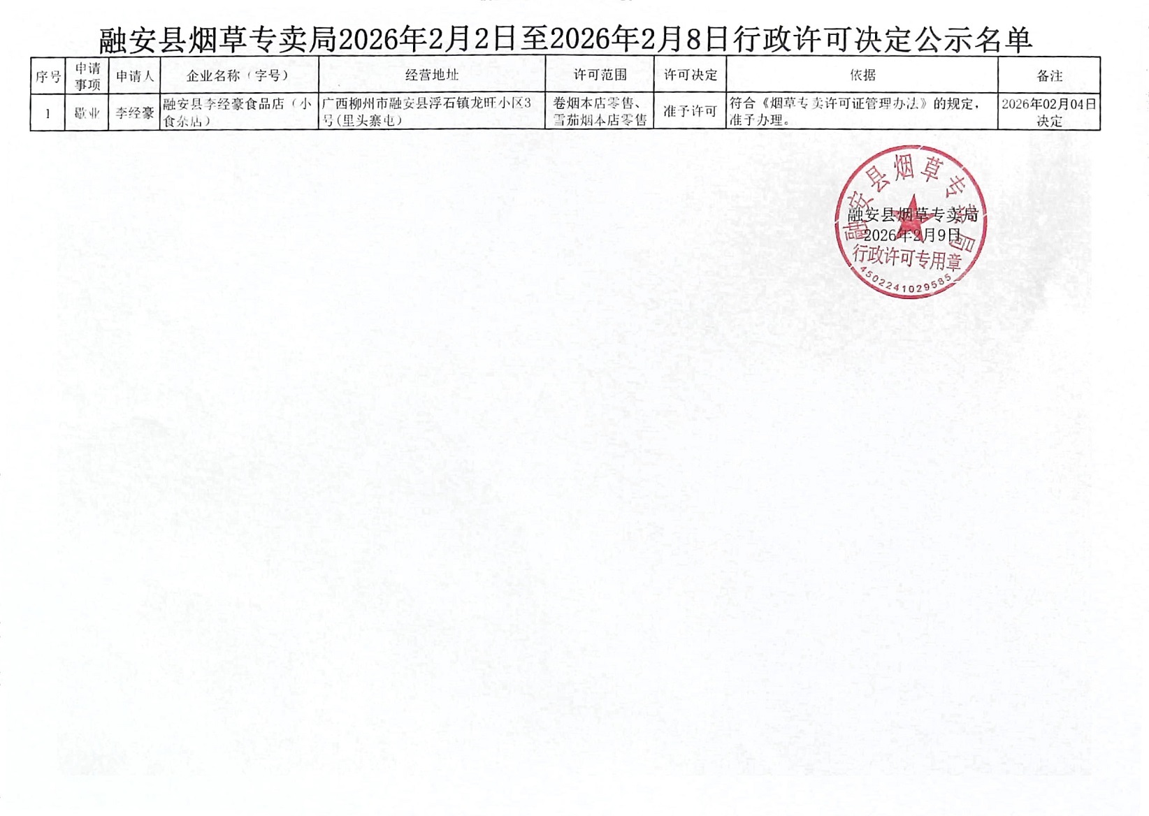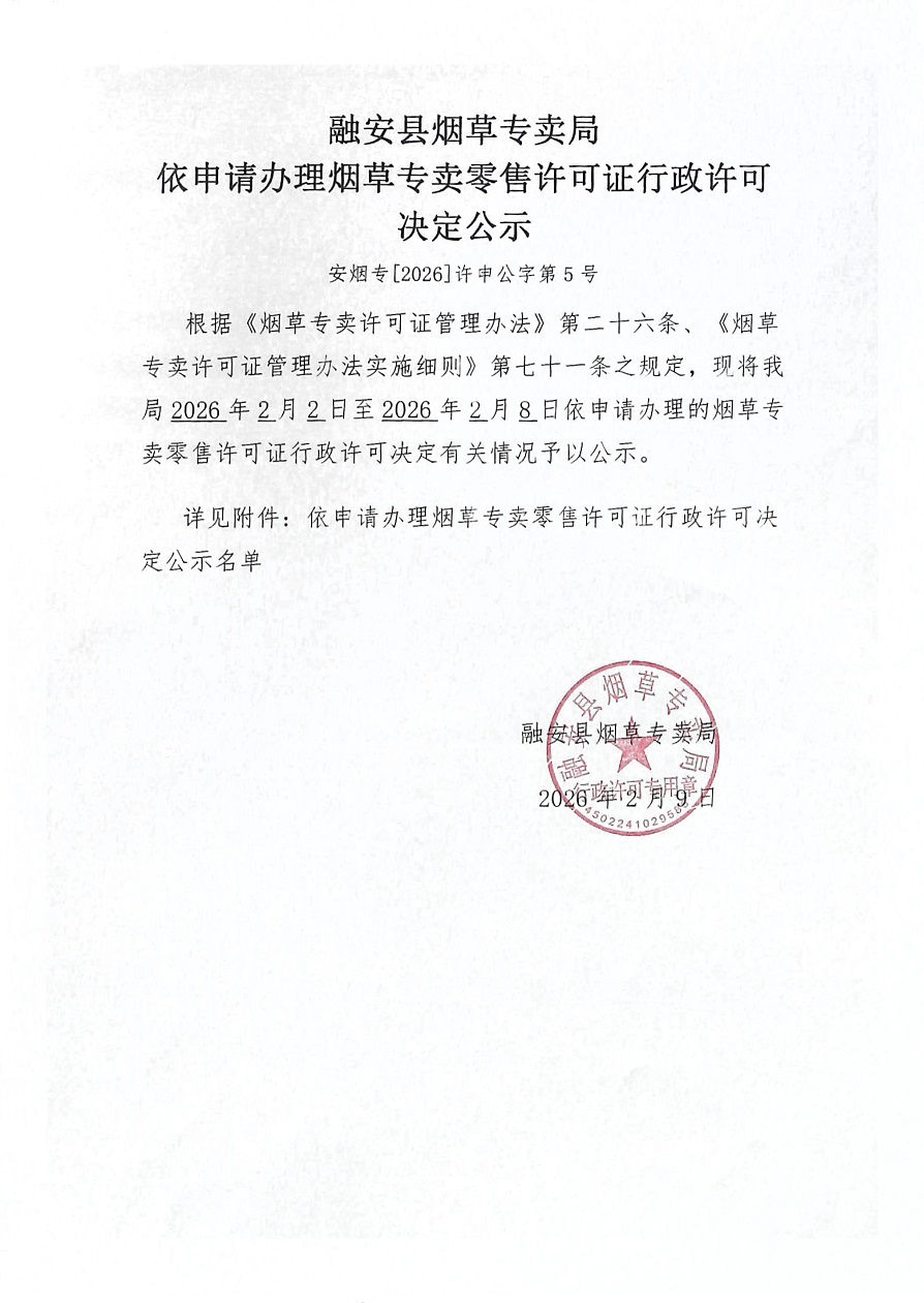 融安县烟草专卖局依申请办理烟草专卖零售许可证行政许可决定公示(安烟专【2026】许申公字第5号)