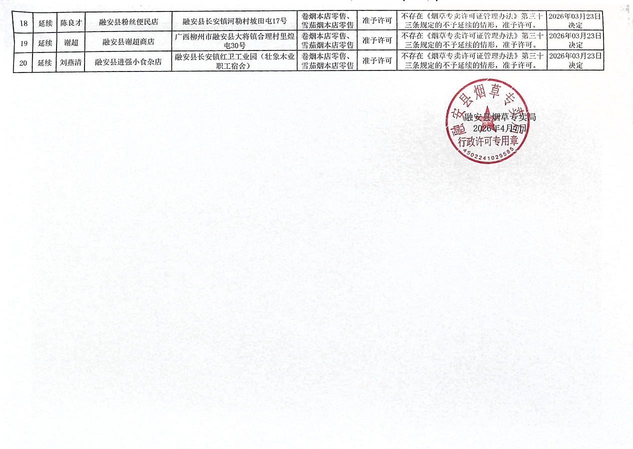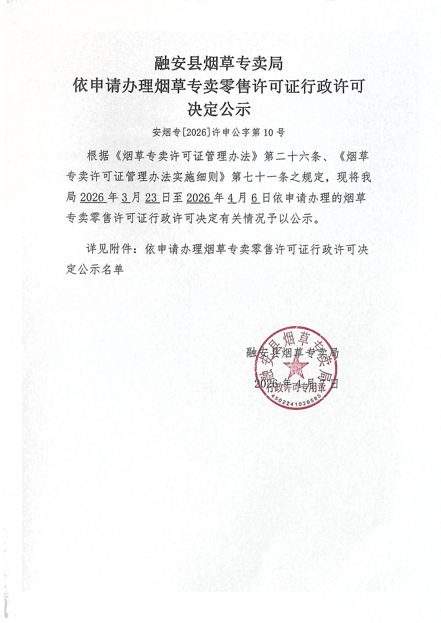 融安县烟草专卖局依申请办理烟草专卖零售许可证行政许可决定公示(安烟专【2026】许申公字第10号)