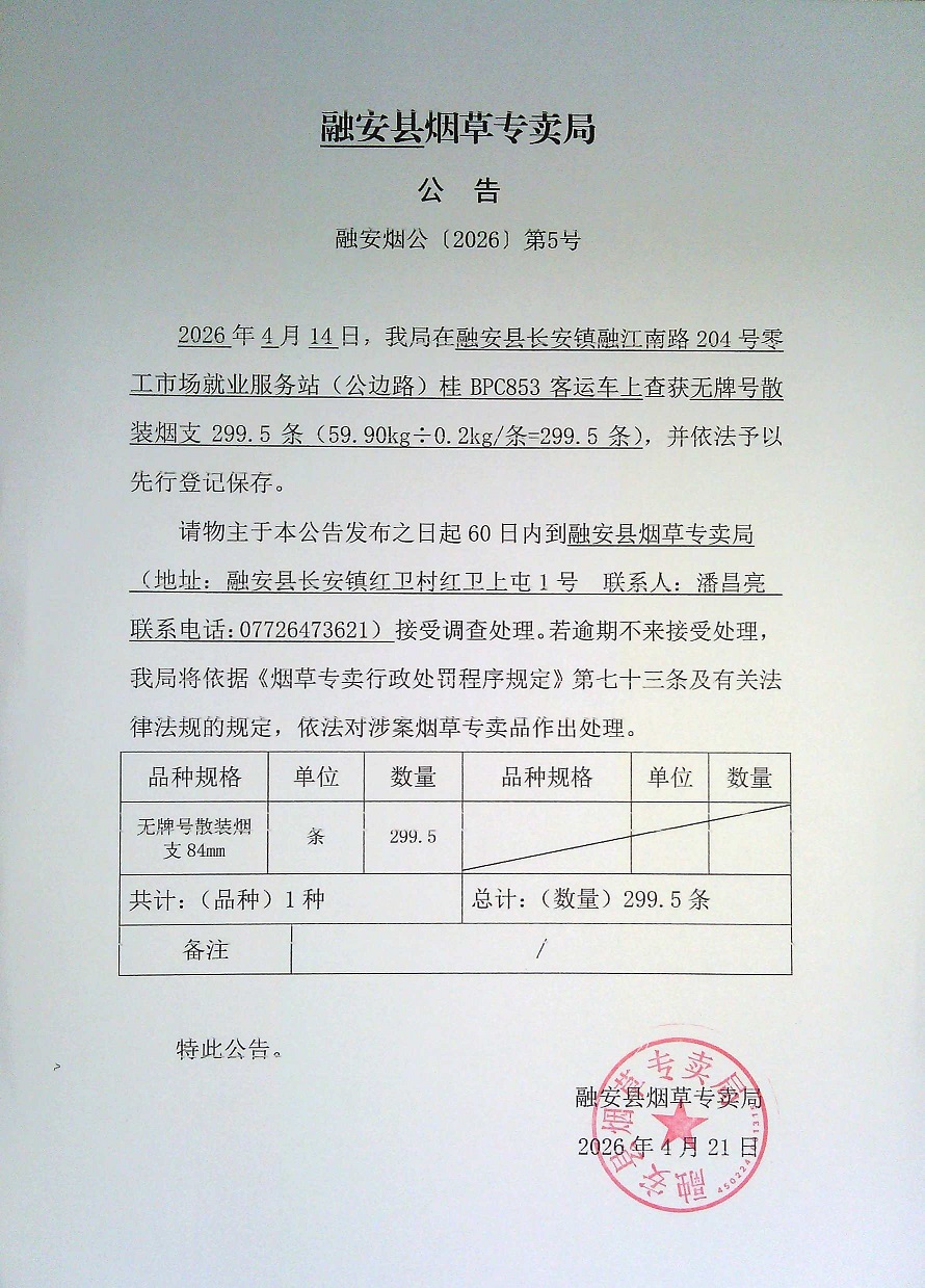 融安县烟草专卖局公告(融安烟公【2026】第5号)