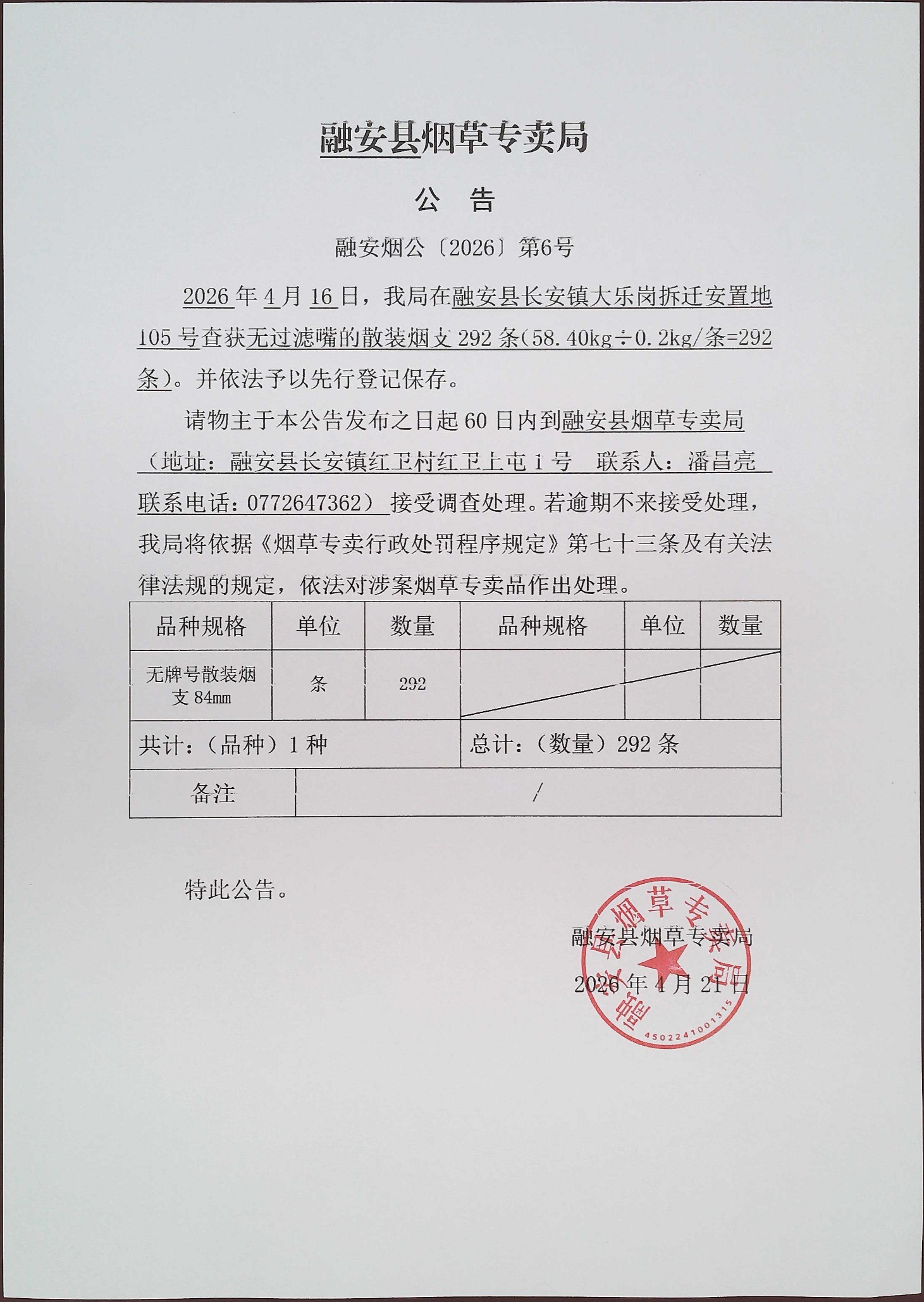 融安县烟草专卖局公告(融安烟公【2026】第6号)