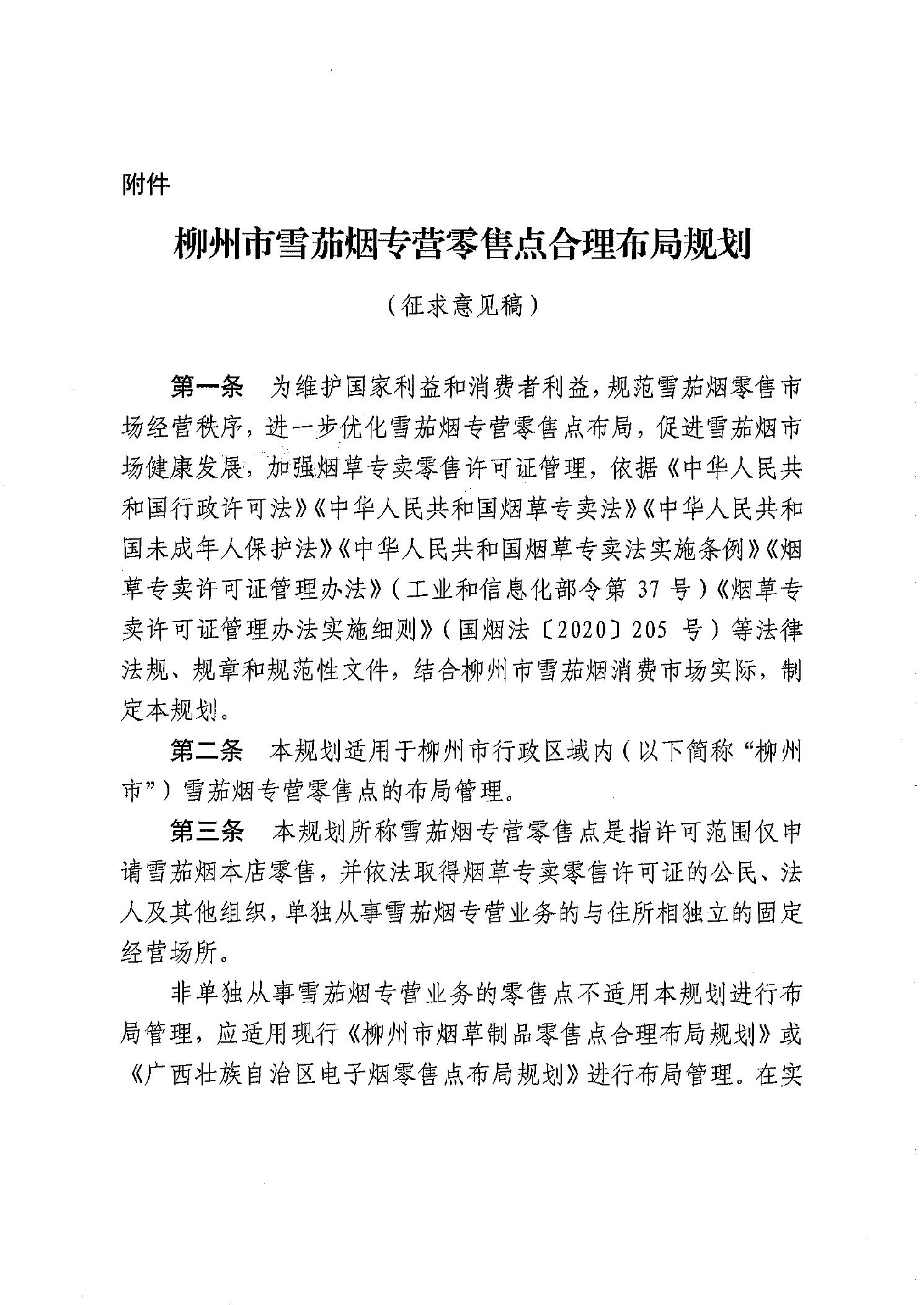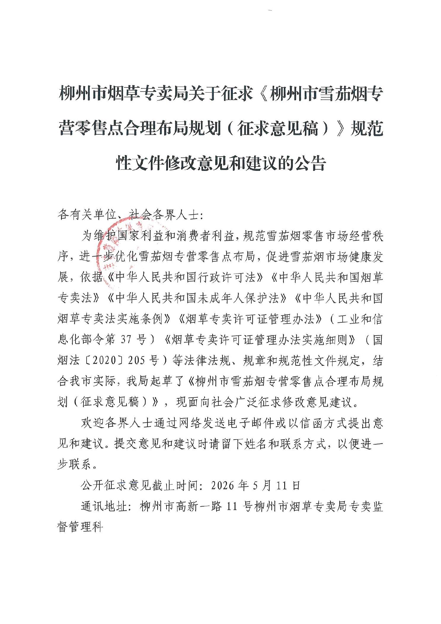 柳州市烟草专卖局关于征求《柳州市雪茄烟专营零售点合理布局规划(征求意见稿)》规范性文件修改意见和建议的公告