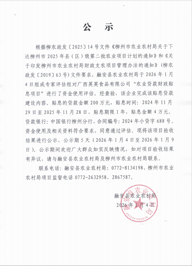 广西英英食品有限公司“农业贷款财政贴息项目”验收结果公示