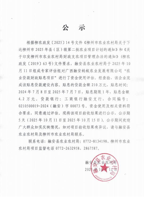 广西融安蚂蚁农业发展有限公司“农业贷款财政贴息项目”验收结果公示