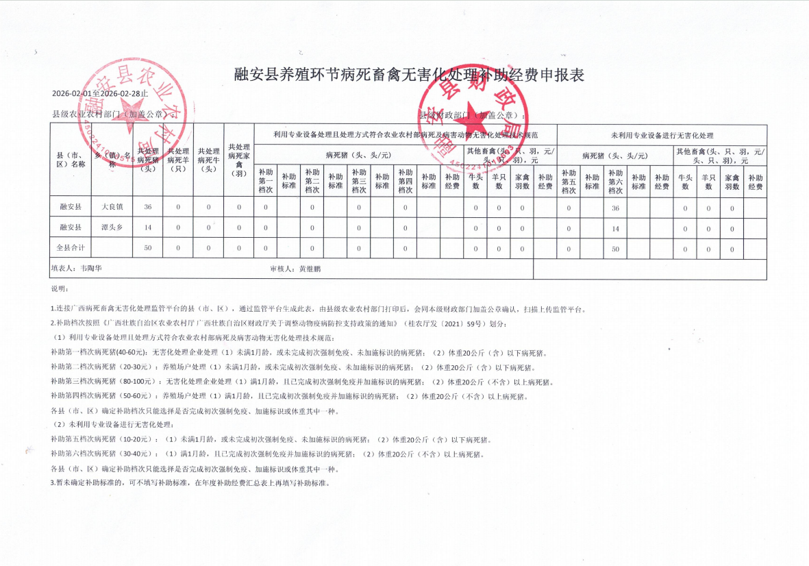 2026年2月养殖环节病死畜禽无害化处理补助经费申报表