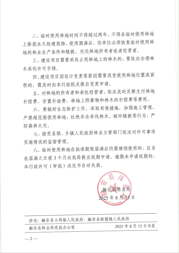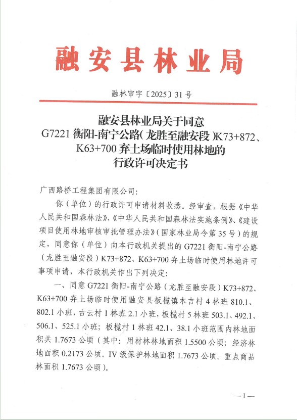 融安县林业局关于同意G7221衡阳-南宁公路(龙胜至融安段)K73+872、K63+700弃土场临时使用林地的行政许可决定书 融林审字〔2025〕31号