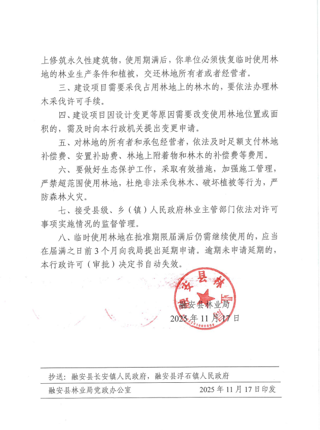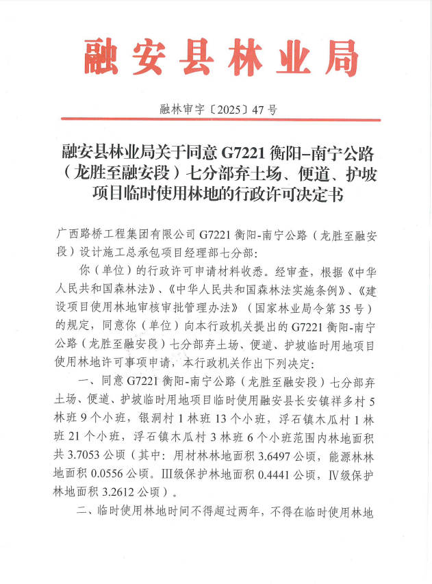 ![融安县林业局关于同意G7221衡阳-南宁公路(龙胜至融安段)七分部弃土场、便道、护坡项目临时使用林地的行政许可决定书融林审字[2025] 47号2.png](./W020251120645867124990_ORIGIN.png)