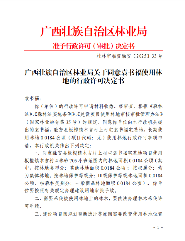 广西壮族自治区林业局关于同意袁书福使用林地的行政许可决定书桂林审准资融安〔2025〕33 号