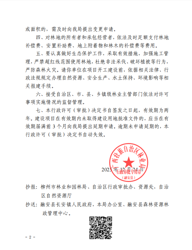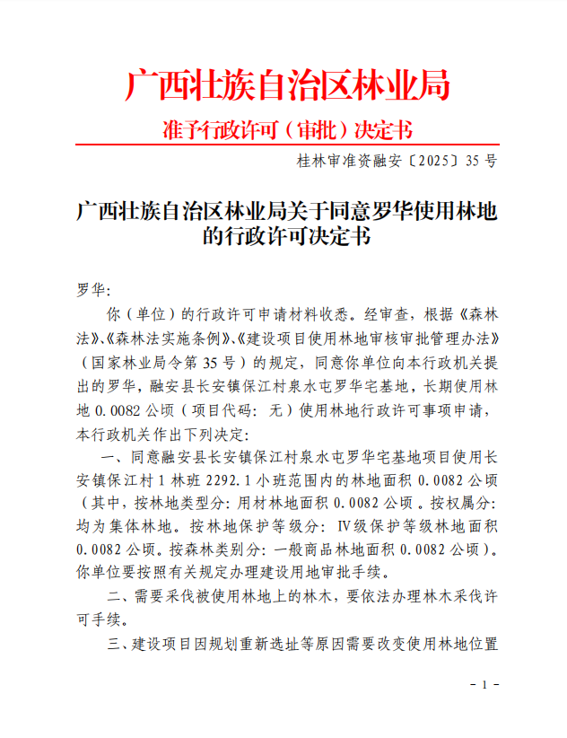 广西壮族自治区林业局关于同意罗华使用林地的行政许可决定书桂林审准资融安〔2025〕35 号