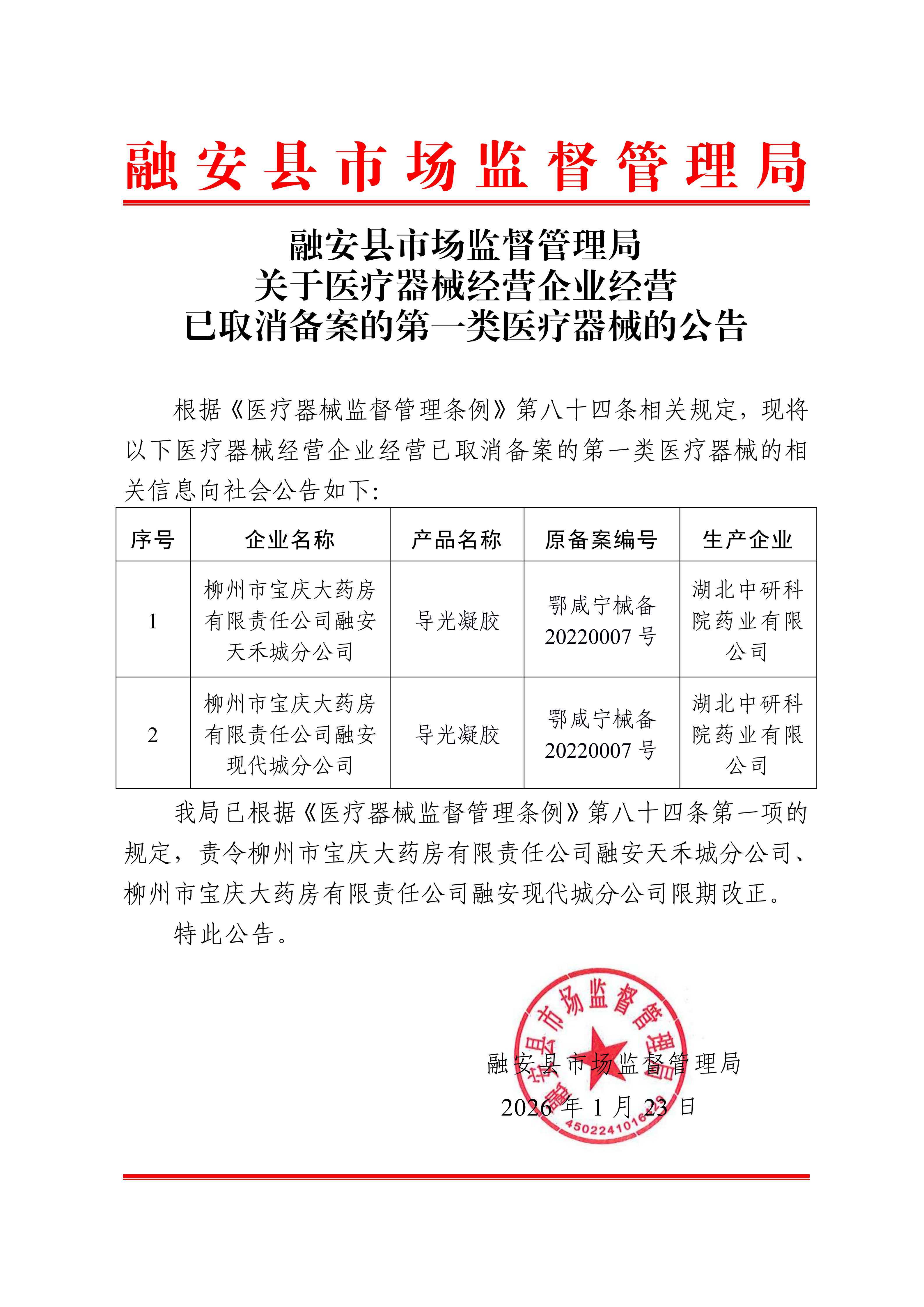 融安县市场监督管理局关于医疗器械经营企业经营已取消备案的第一类医疗器械的公告