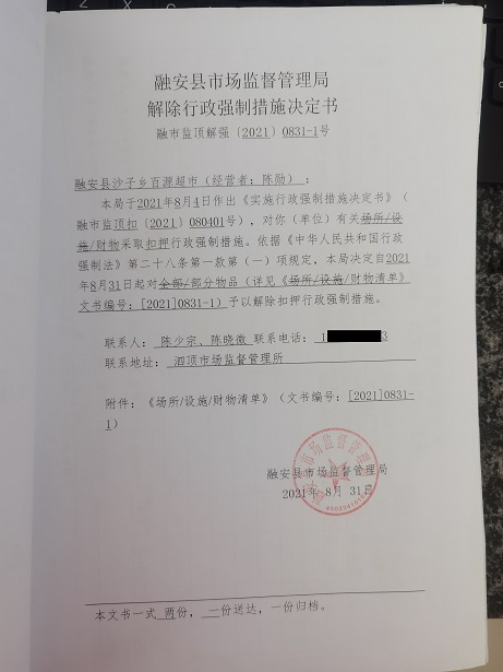 融安县市场监督管理局 行政强制措施决定书 融市监顶解强〔2021〕0831-1号
