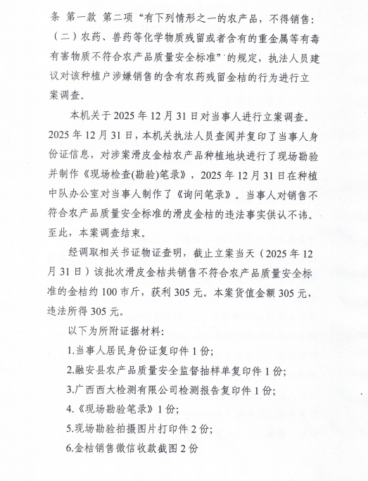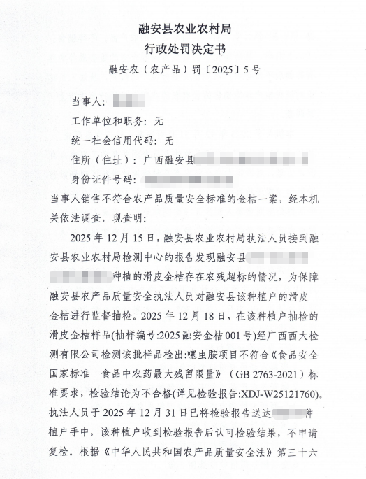 融安县农业农村局行政处罚决定书 融安农(农产品)罚〔2025〕5号