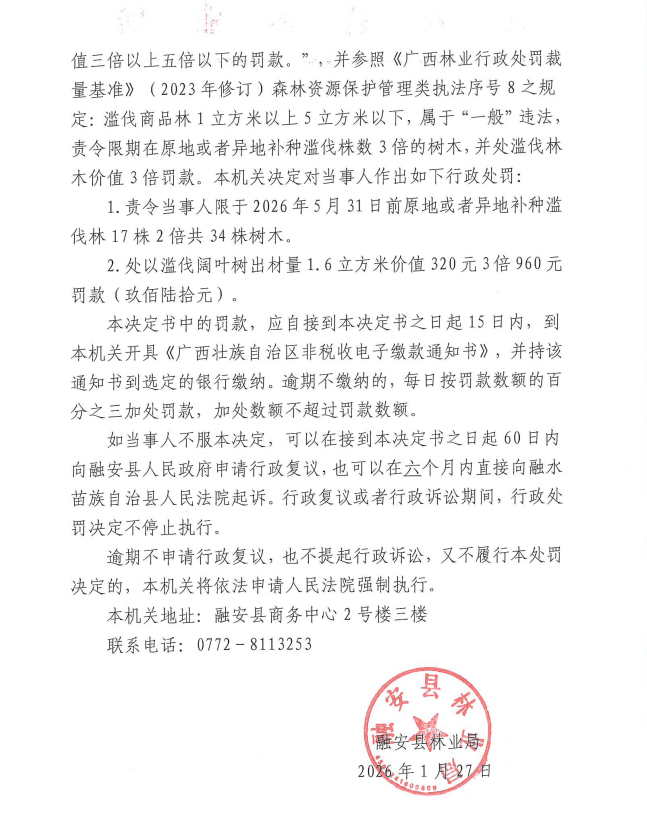 融安县林业局 林业行政处罚决定书 融林罚决字〔2026〕001 号