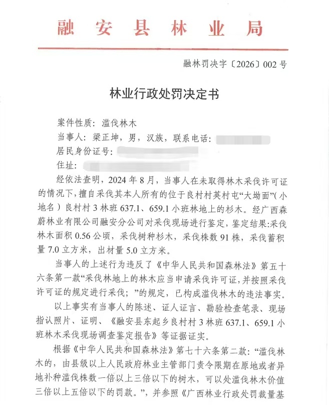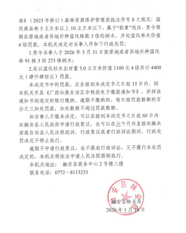 融安县林业局 林业行政处罚决定书 融林罚决字〔2026〕002号