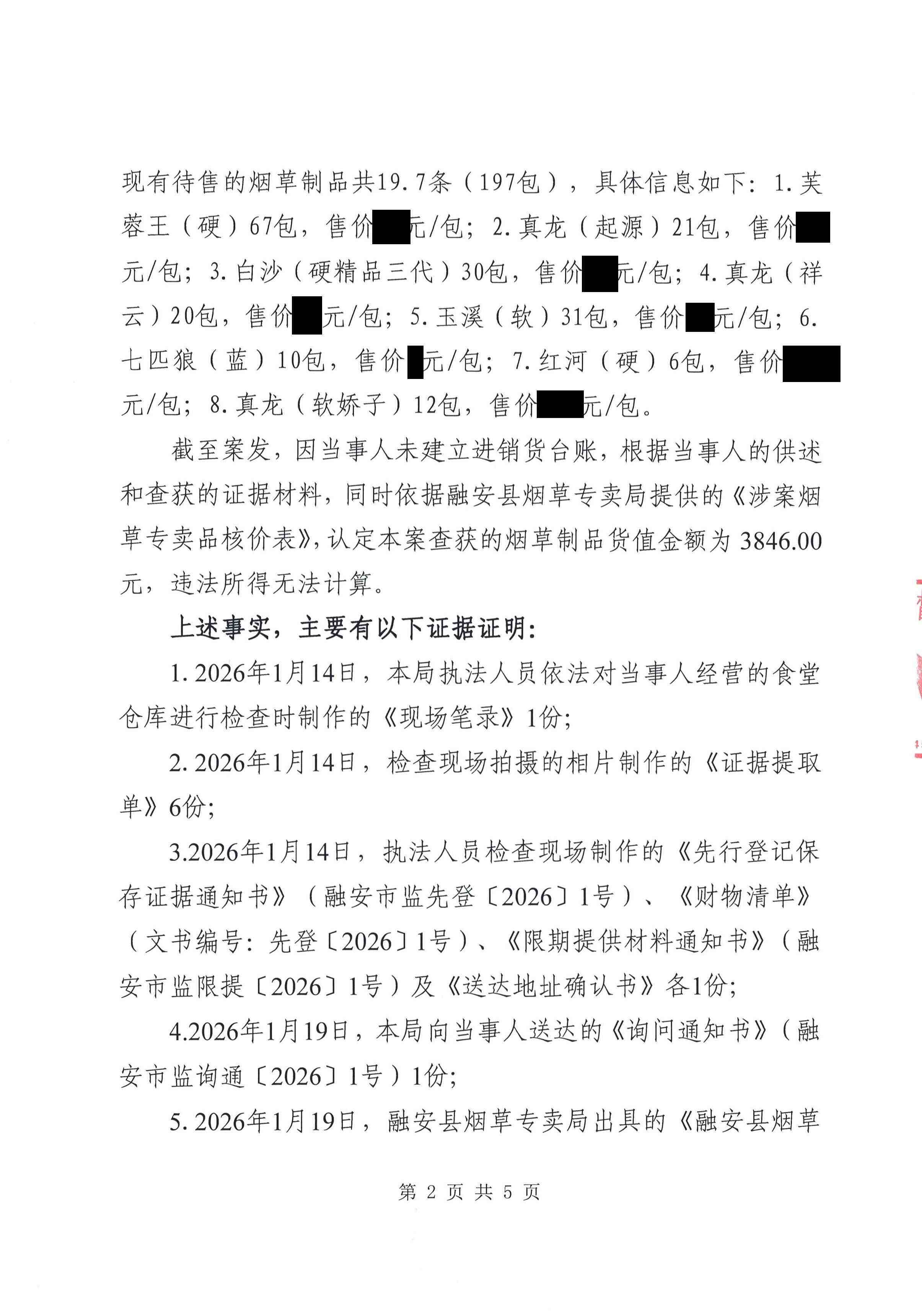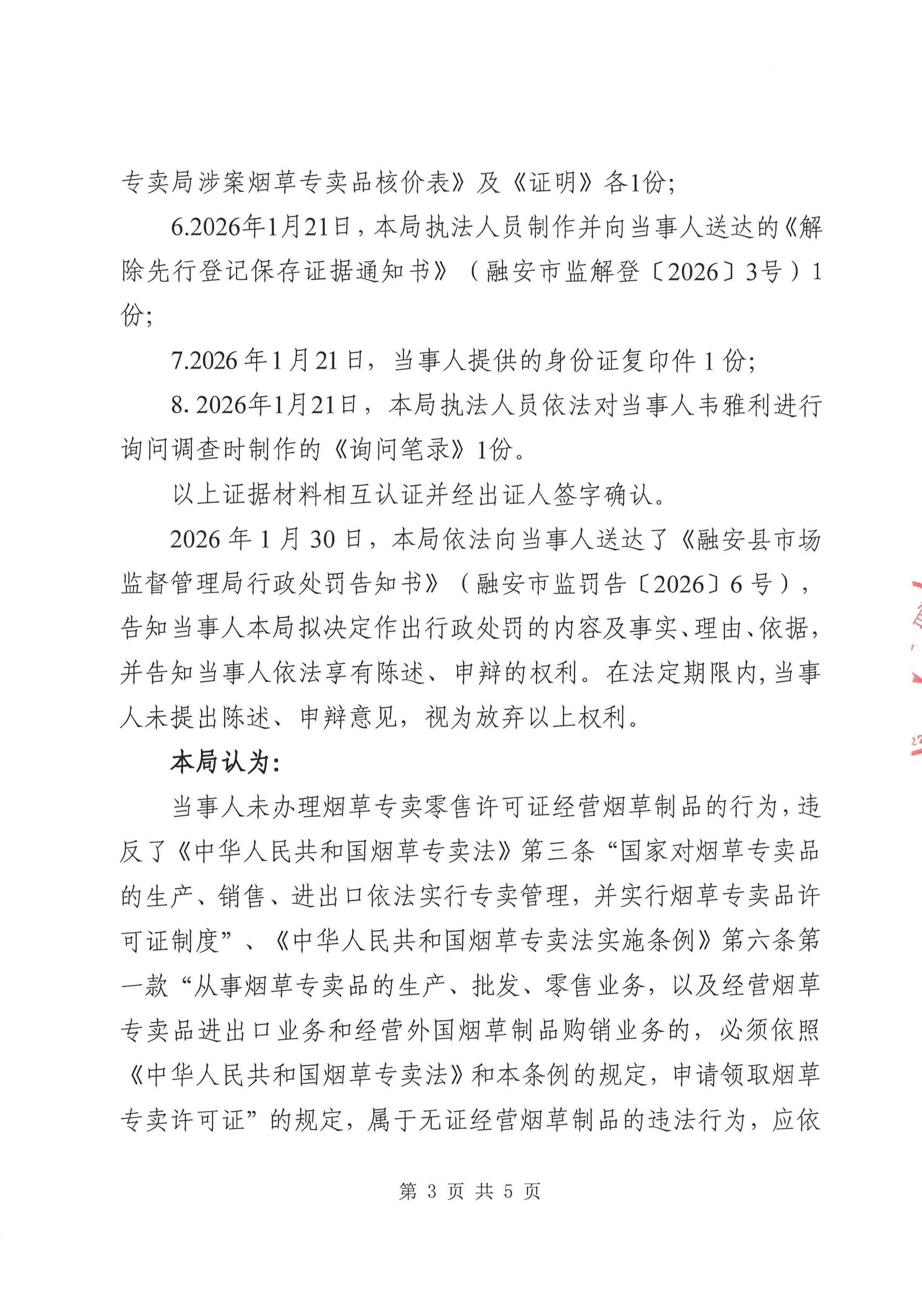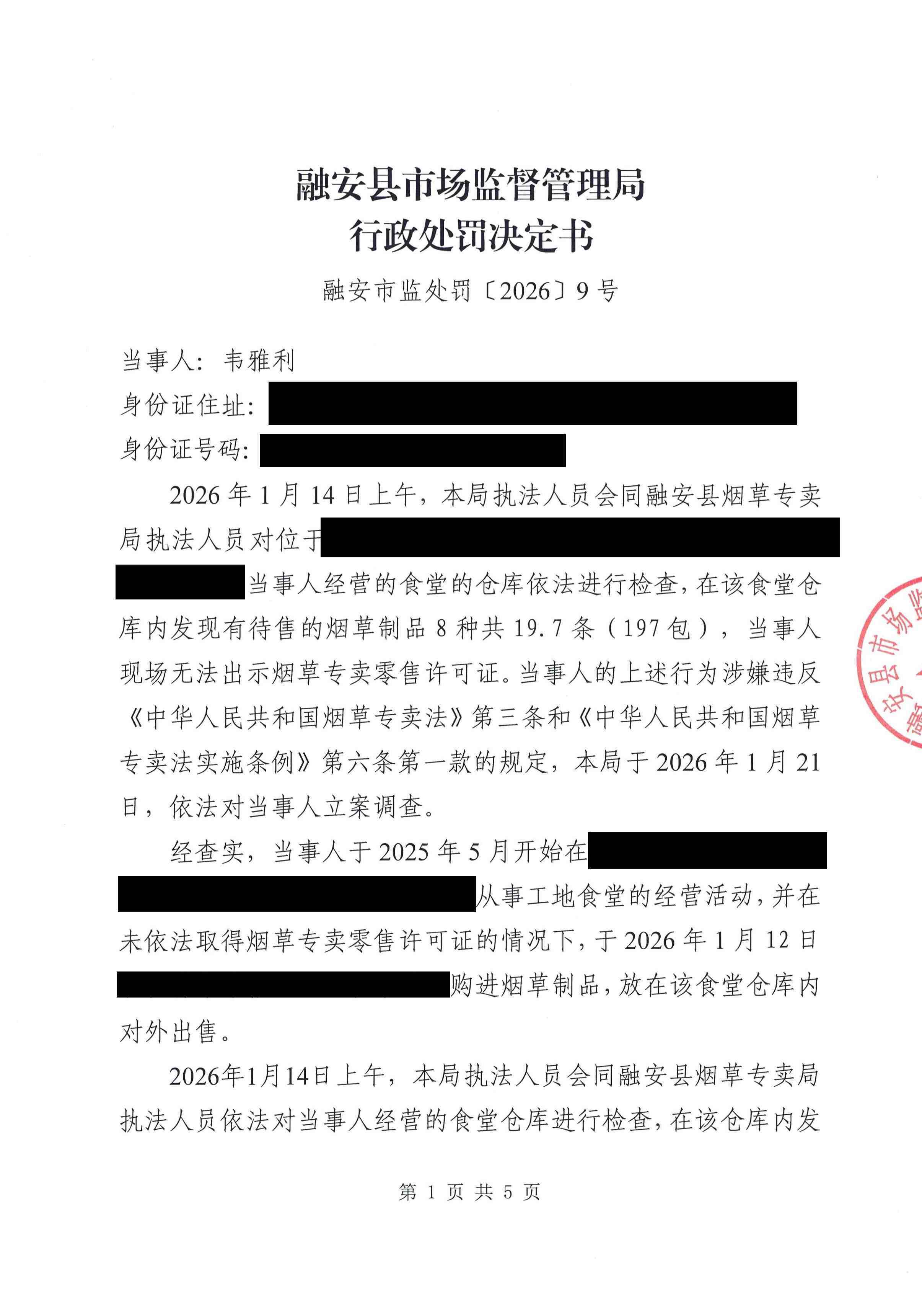 融安县市场监督管理局 行政处罚决定书融安市监处罚〔2026〕9号
