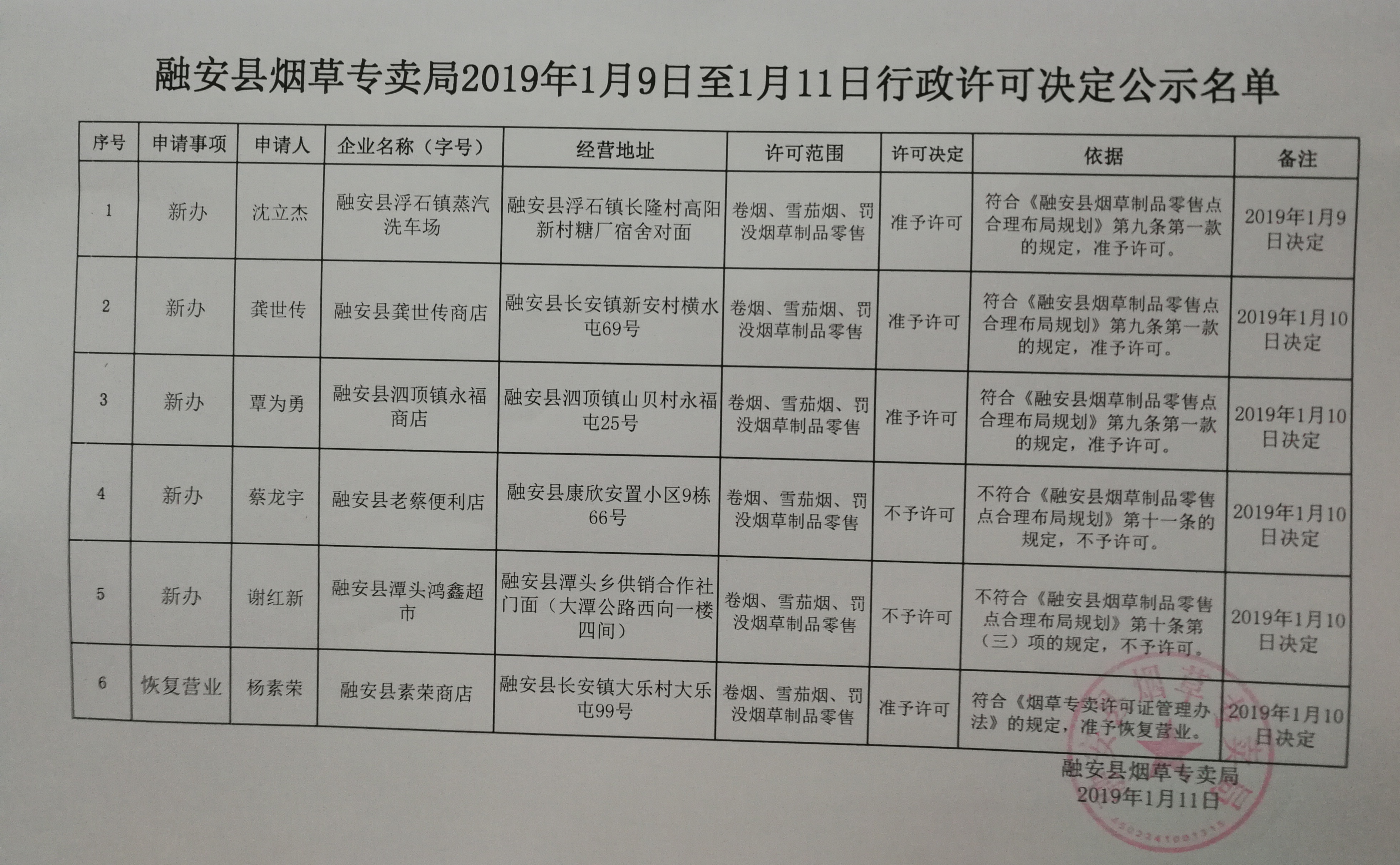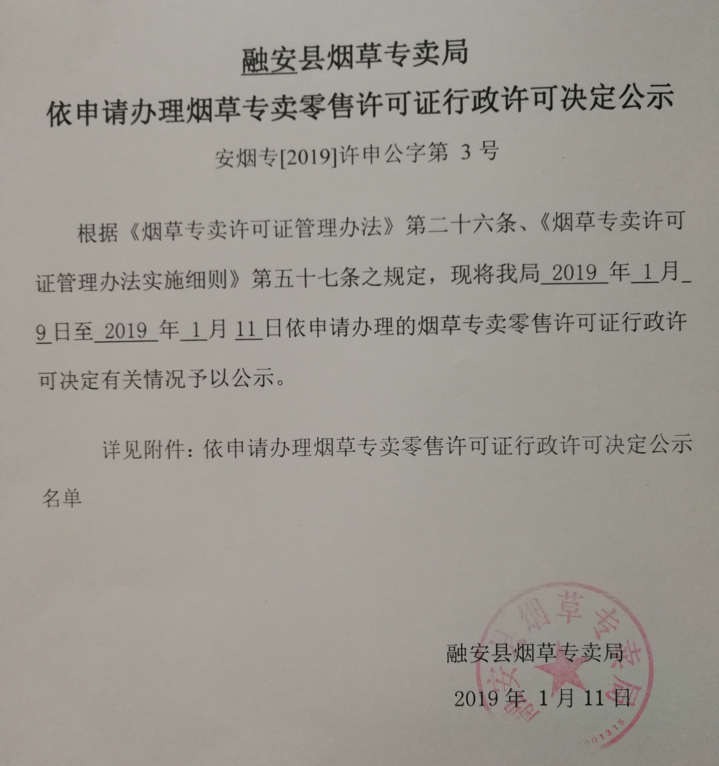 依申请办理烟草专卖零售许可证行政许可决定公示 (安烟专[2019]许申公字第3号)