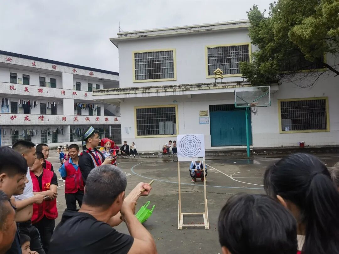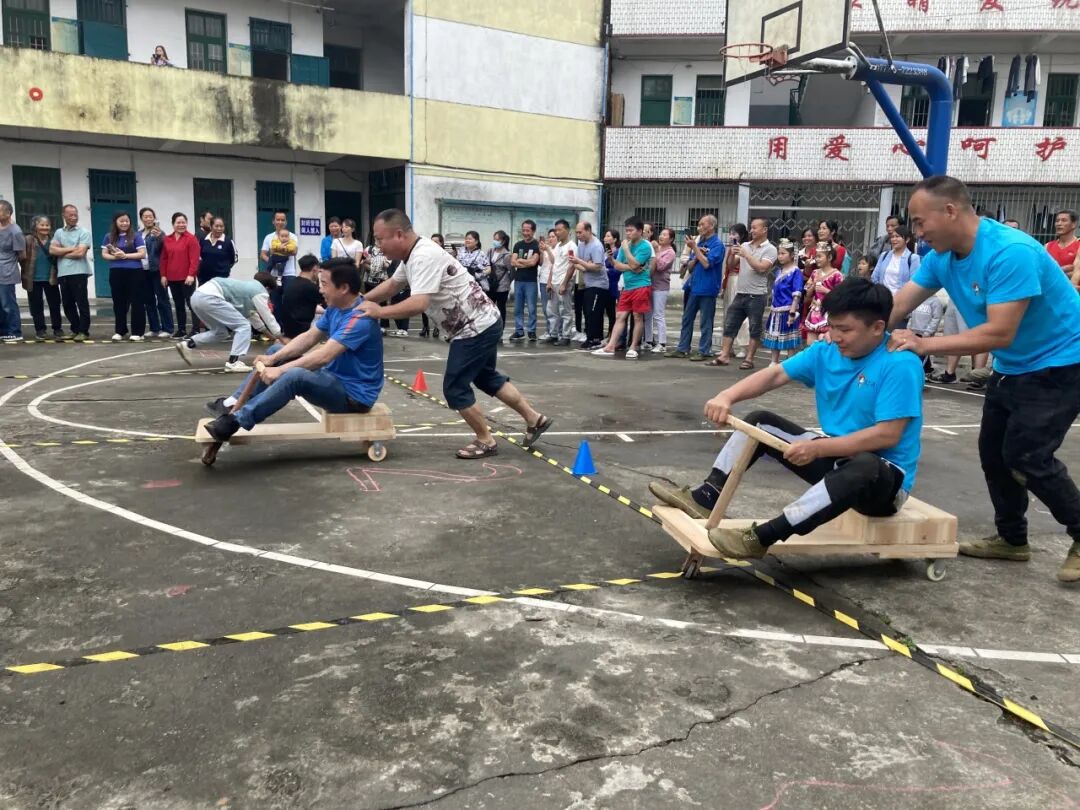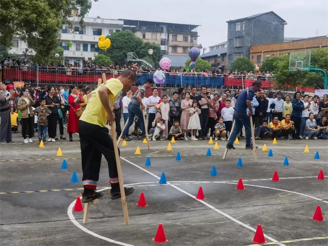 开展各类趣味民俗游戏活动,包括踩高跷、跳大绳、滚铁环、打纸炮、打陀螺、手工竹编、推玻珠车~