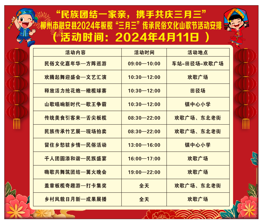 欢迎全镇各族人民,以及八方亲友宾客、广大游客朋友4月11日到板榄镇板榄街游玩、体验壮族三月三的魅力,好客板榄欢迎您!