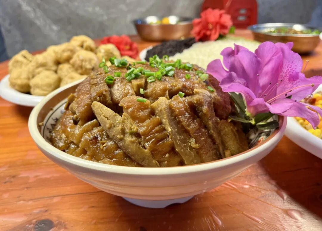 “芋头携泥烹美味,一家蒸扣四邻香。”选取上好肥瘦相间的五花肉,经过水煮、油炸、切块、酱料匀捞,再与切成尺寸相近的块状芋头,相间拼摆在海碗中,放入蒸锅以旺火蒸熟,上桌时再用圆碟倒翻,谓之“扣”。吃时芋头与花肉成双入口,芋粉肉香,既香且糯,入口即化。